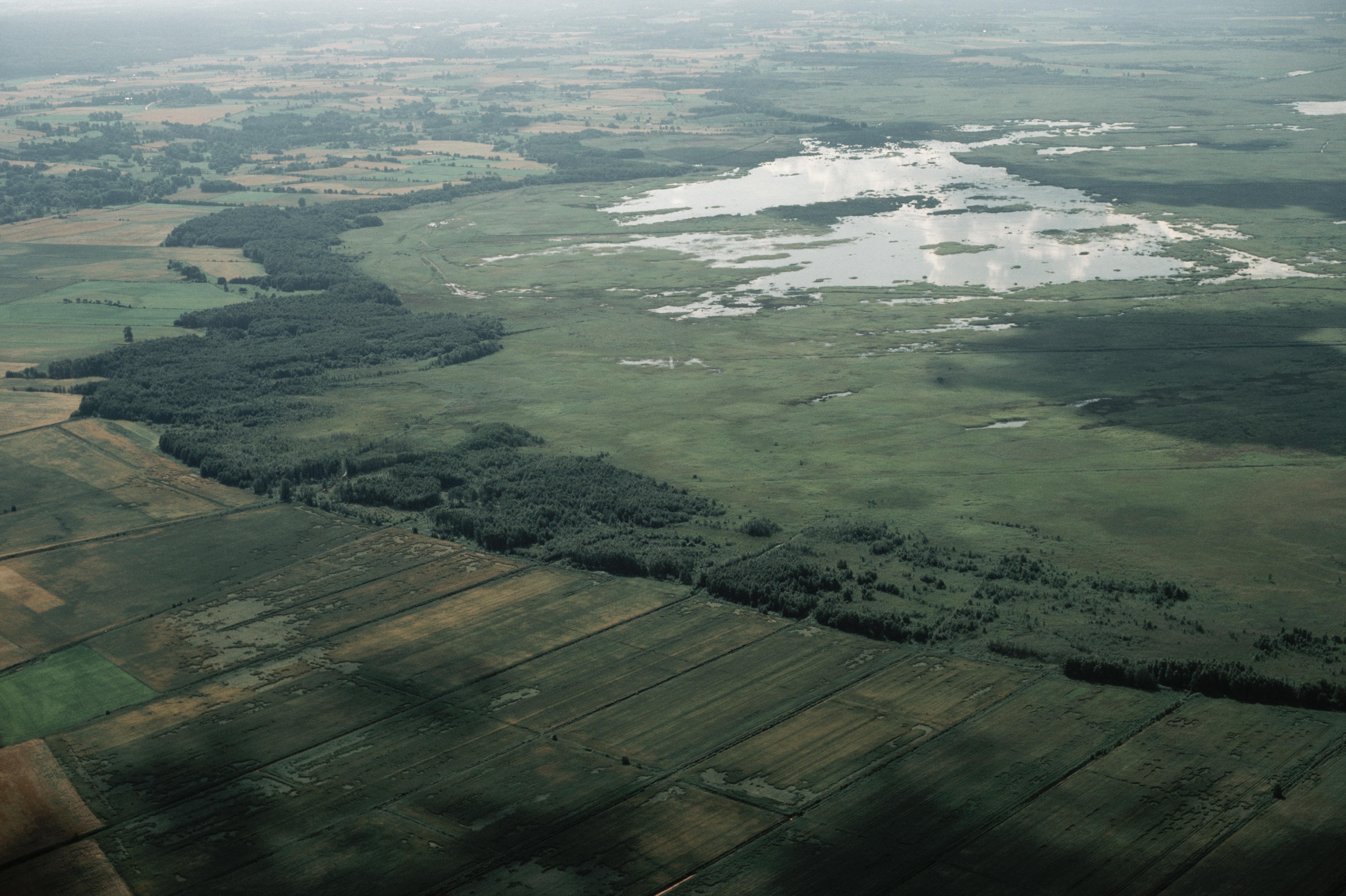 Beskrivning: Hornborgasjöns norra del vid socknen Norra Lundby och Bolum (i bildens övre del). Boplats RAÄnr Norra Lundby 92:1 nere till vänster. Bilden är tagen mot (väderstreck): S