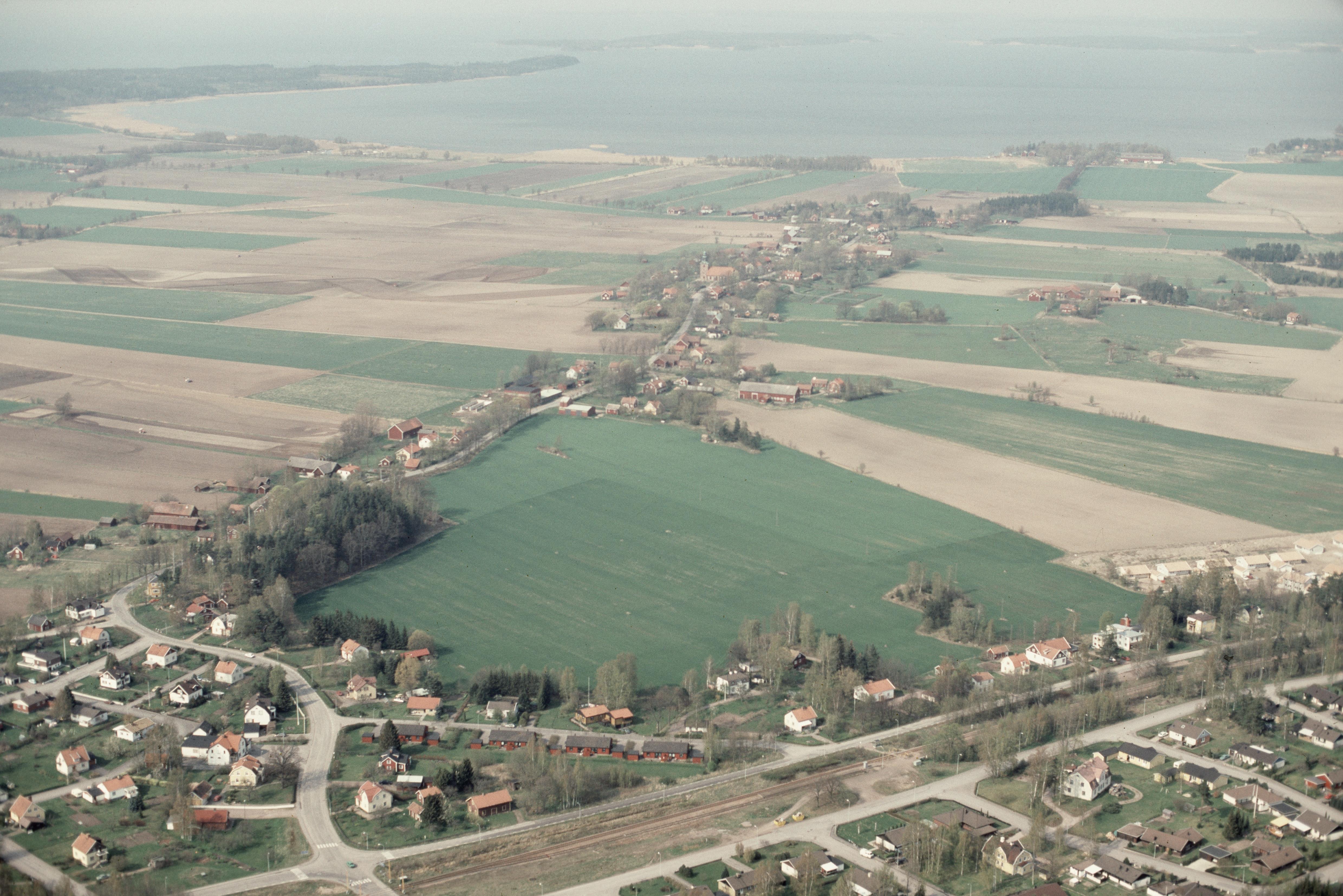 Beskrivning: Björsäters kyrka i bildens övre del. Bilden är tagen mot (väderstreck): NV
