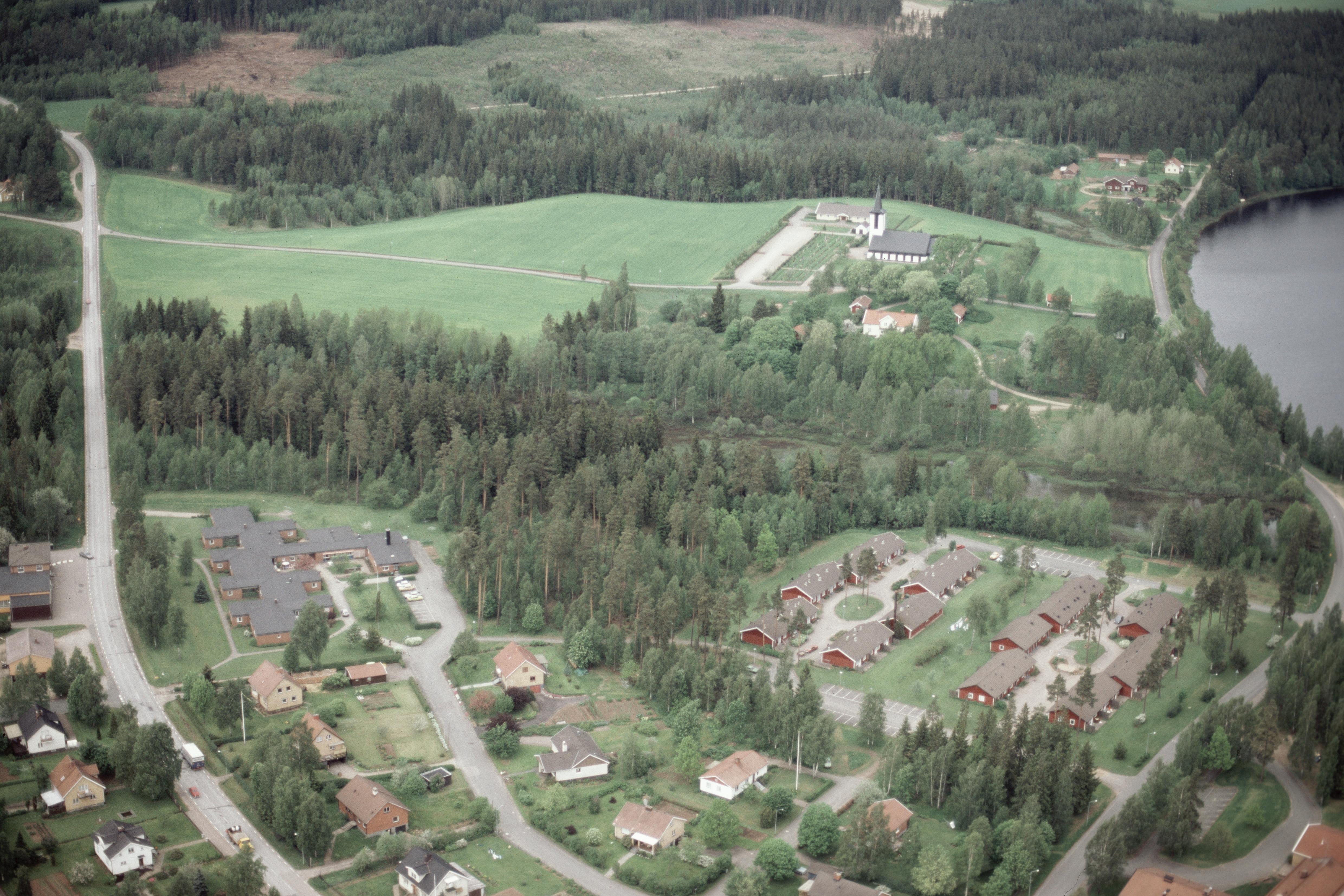 Beskrivning: Dalstorps kyrkby och tätort vid Dalstorpasjön. Dalstorps kyrka till höger över bildens mitt. Bilden är tagen mot (väderstreck): N