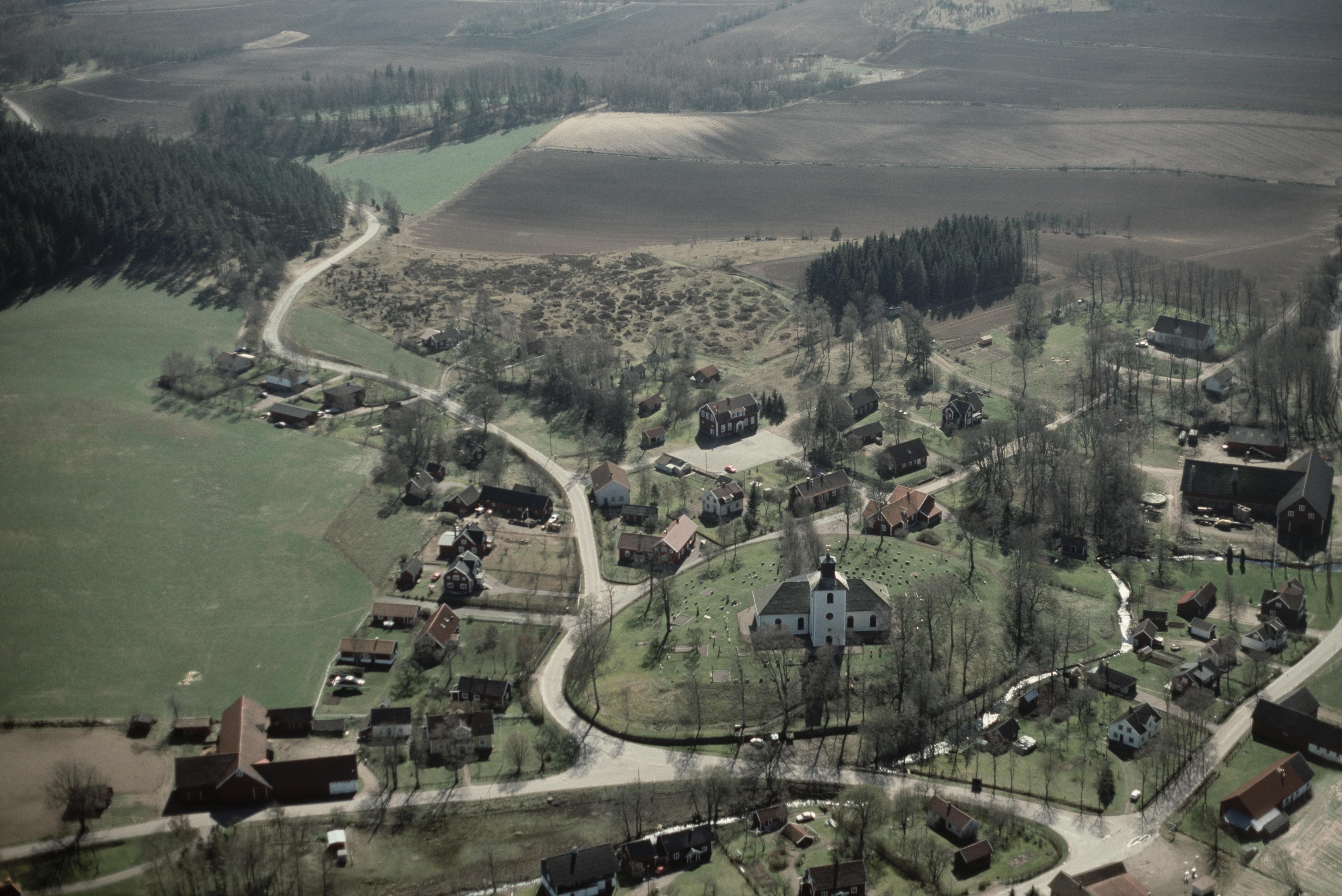 Beskrivning: Dimbo kyrkby. Dimbo-Ottravads kyrka och gravfält RAÄnr Dimbo 6:1 vid bildens mitt. Bilden är tagen mot (väderstreck): S