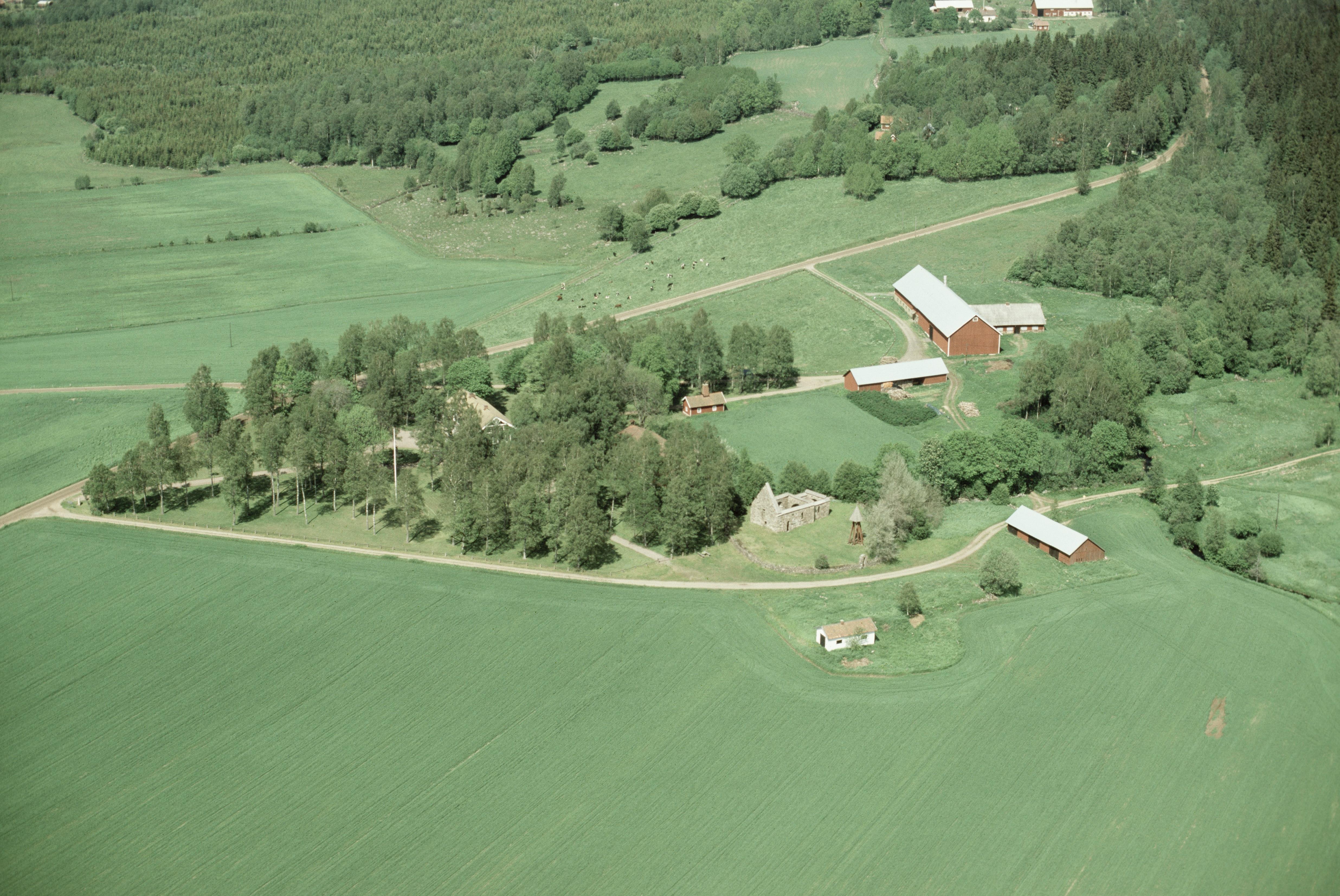 Beskrivning: Fänneslunda kyrkoruin och begravningsplats RAÄnr Fänneslunda 5:1-2 vid bildens mitt. Bilden är tagen mot (väderstreck): NNO