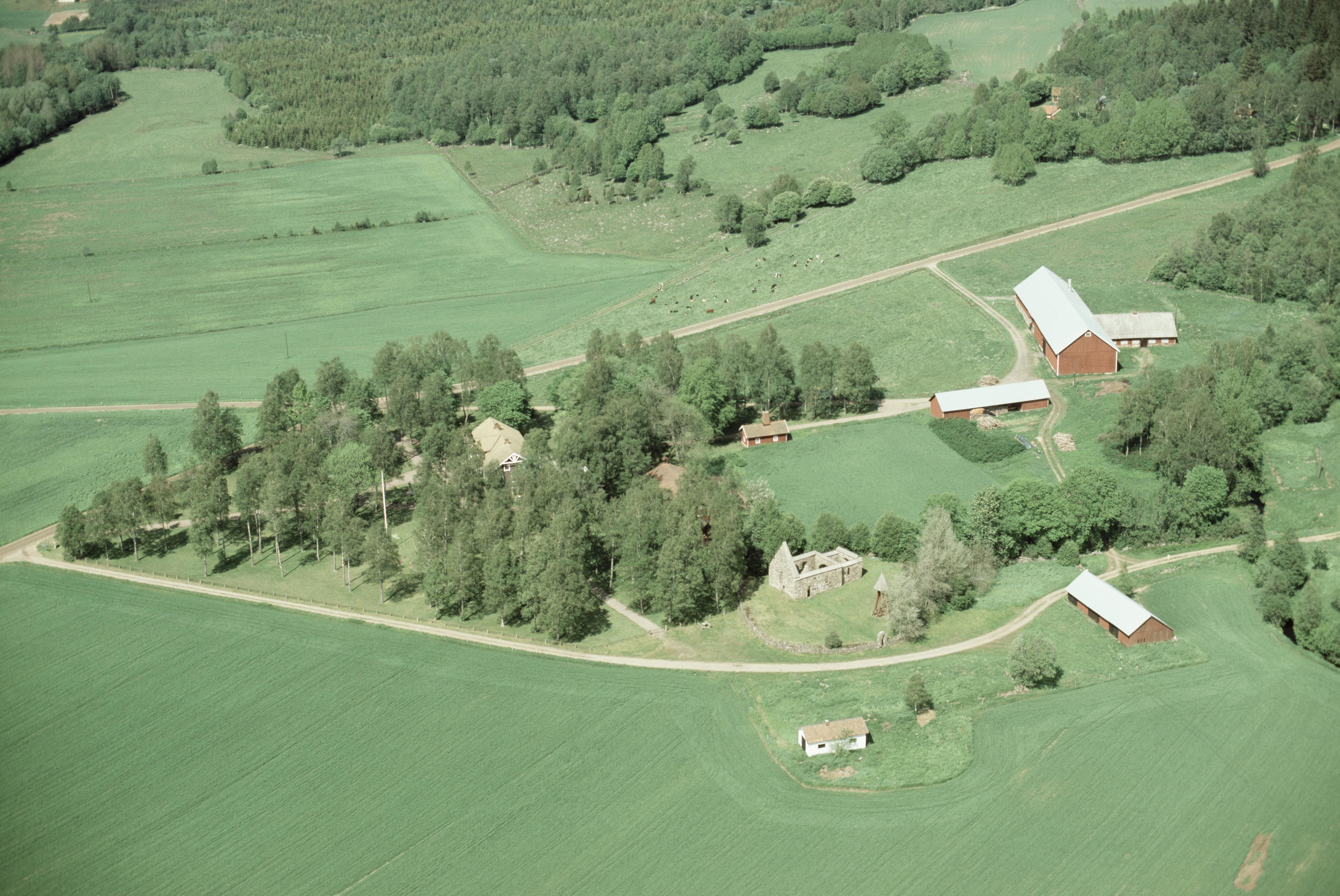 Beskrivning: Fänneslunda kyrkoruin och begravningsplats RAÄnr Fänneslunda 5:1-2 under bildens mitt. Bilden är tagen mot (väderstreck): NNO