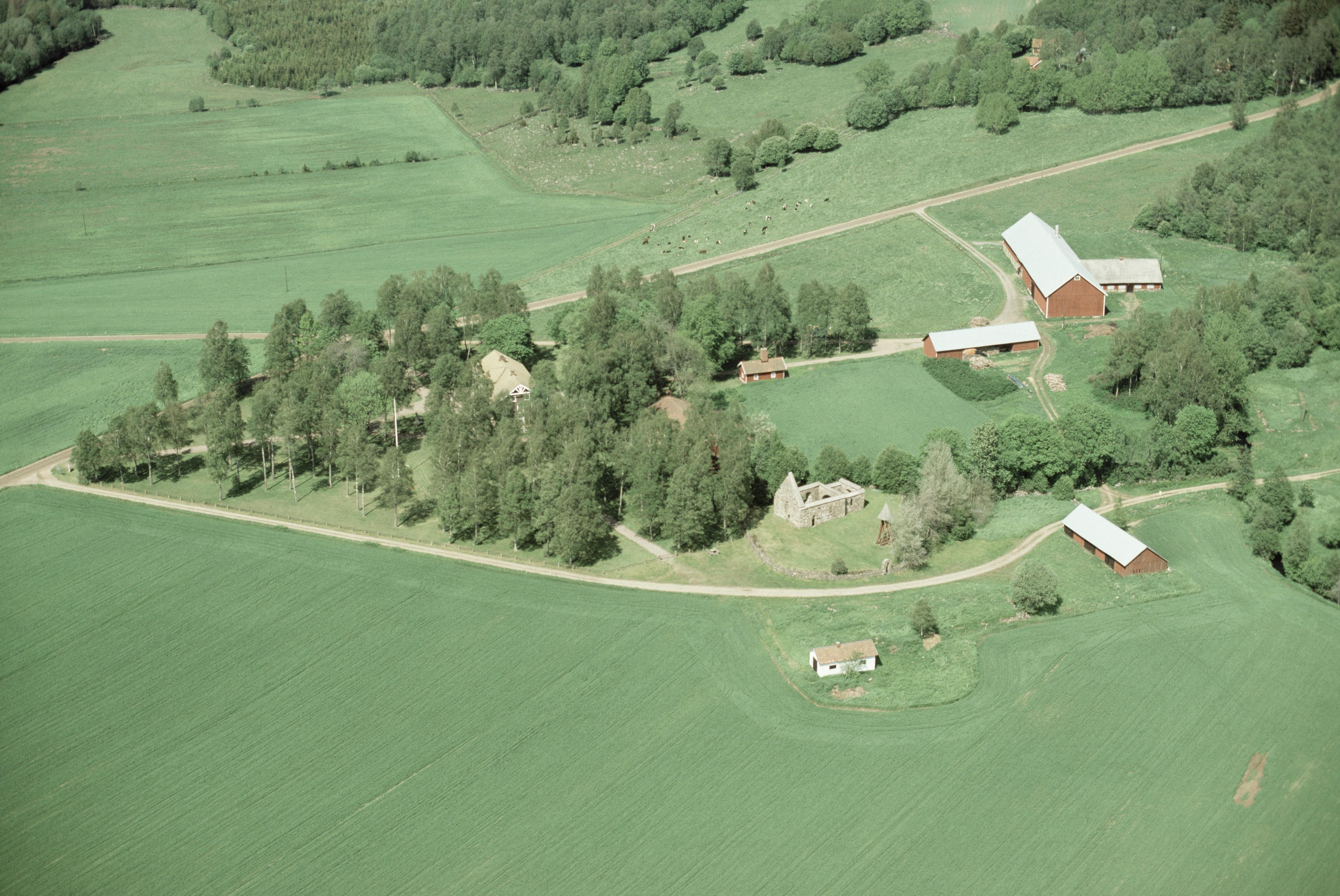 Beskrivning: Fänneslunda kyrkoruin och begravningsplats RAÄnr Fänneslunda 5:1-2 vid bildens mitt. Bilden är tagen mot (väderstreck): NNO