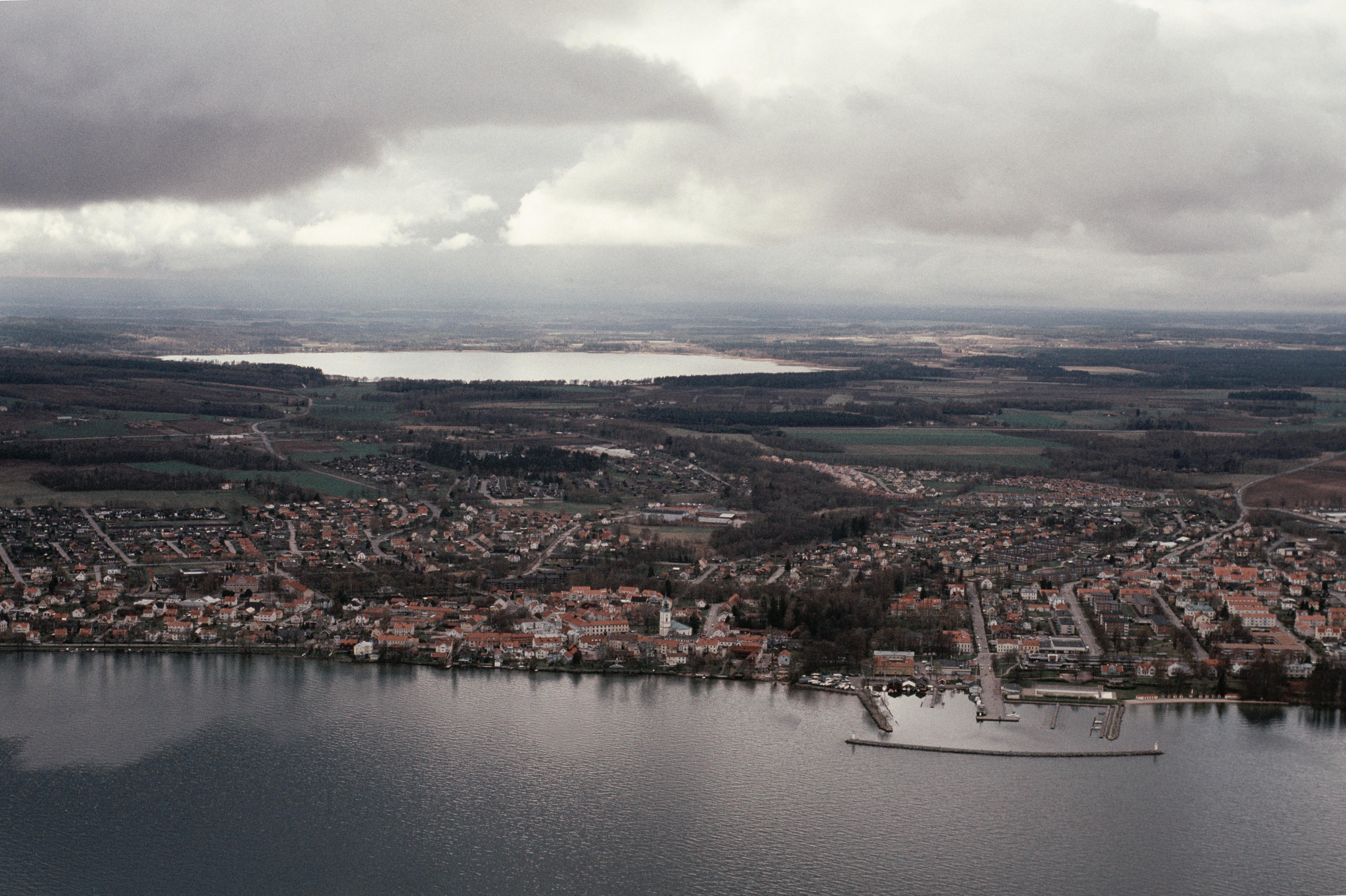 Beskrivning: Hjo stad vid sjön Vättern. Hjo kyrka under bildens mitt. Bilden är tagen mot (väderstreck): NV