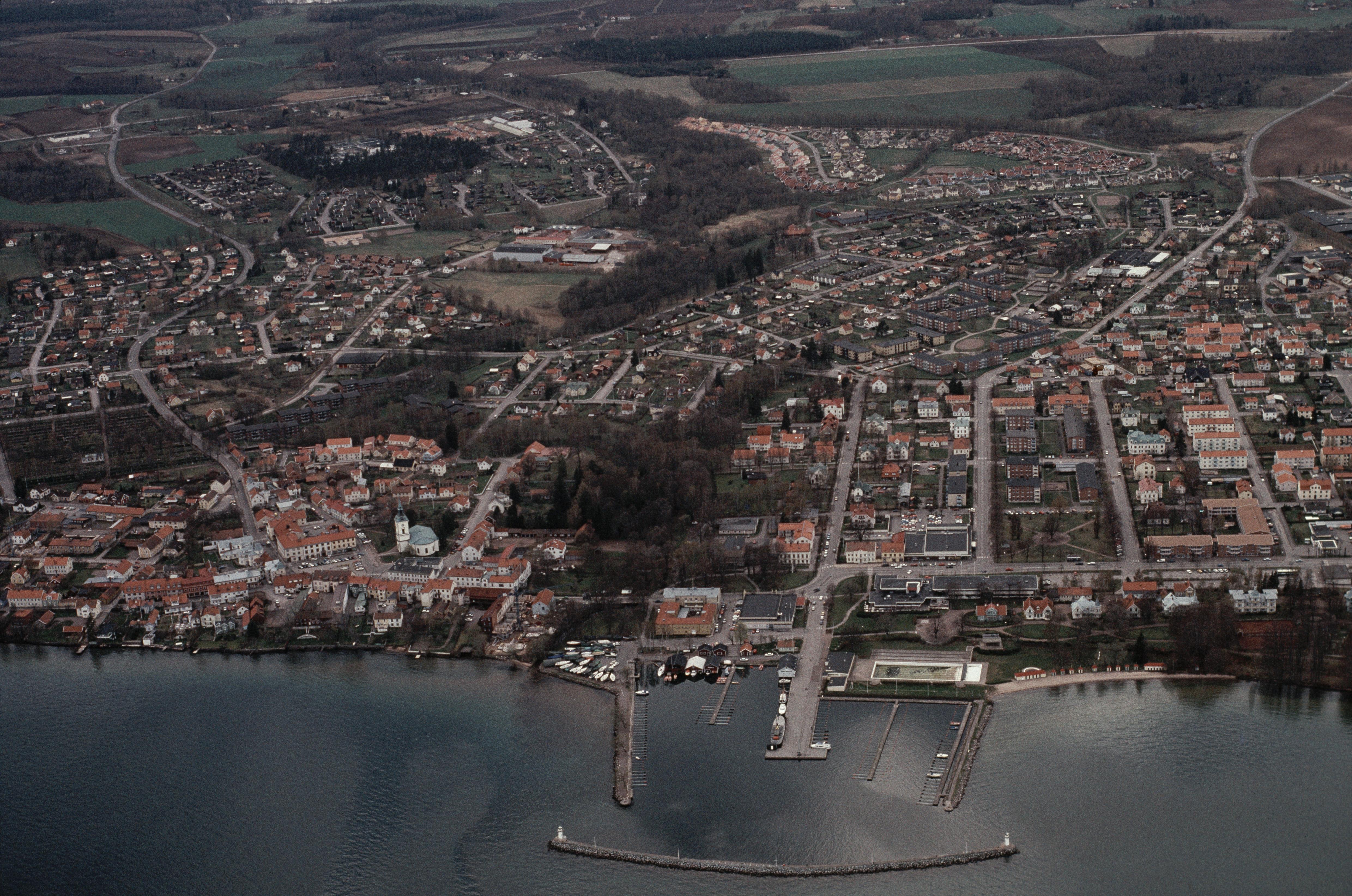 Beskrivning: Hjo stad vid sjön Vättern. Hjo kyrka till vänster under bildens mitt. Bilden är tagen mot (väderstreck): NV