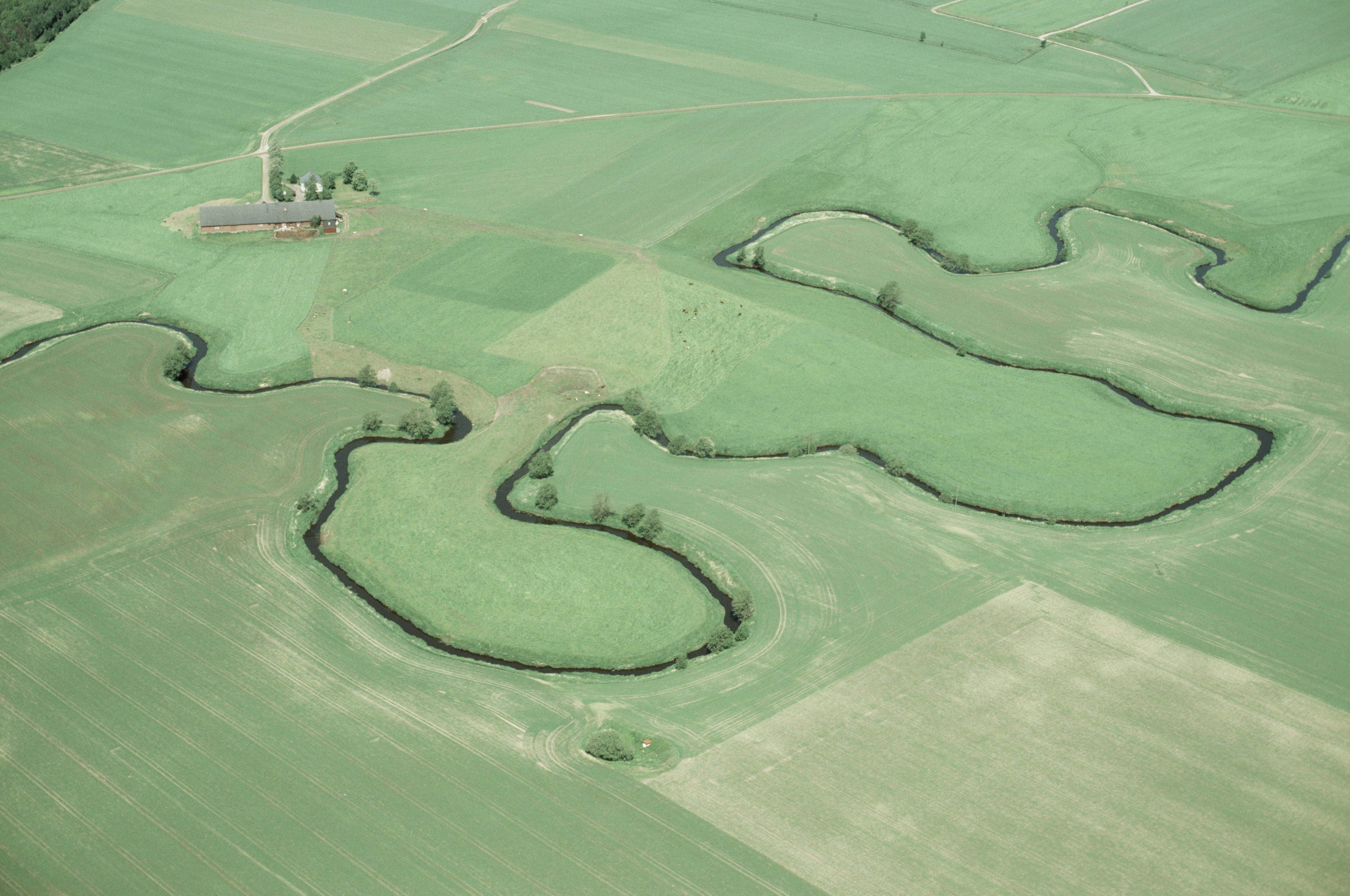 Beskrivning: Norra delen av Uddeholm. Meanderslingor i ån Surtan på gränsen mellan socknen Surteby-Kattunga och Fotskäl (i bildens övre del). Larsgården och fyndplats Fotskäl 71:1 uppe till vänster. Bilden är tagen mot (väderstreck): NNV