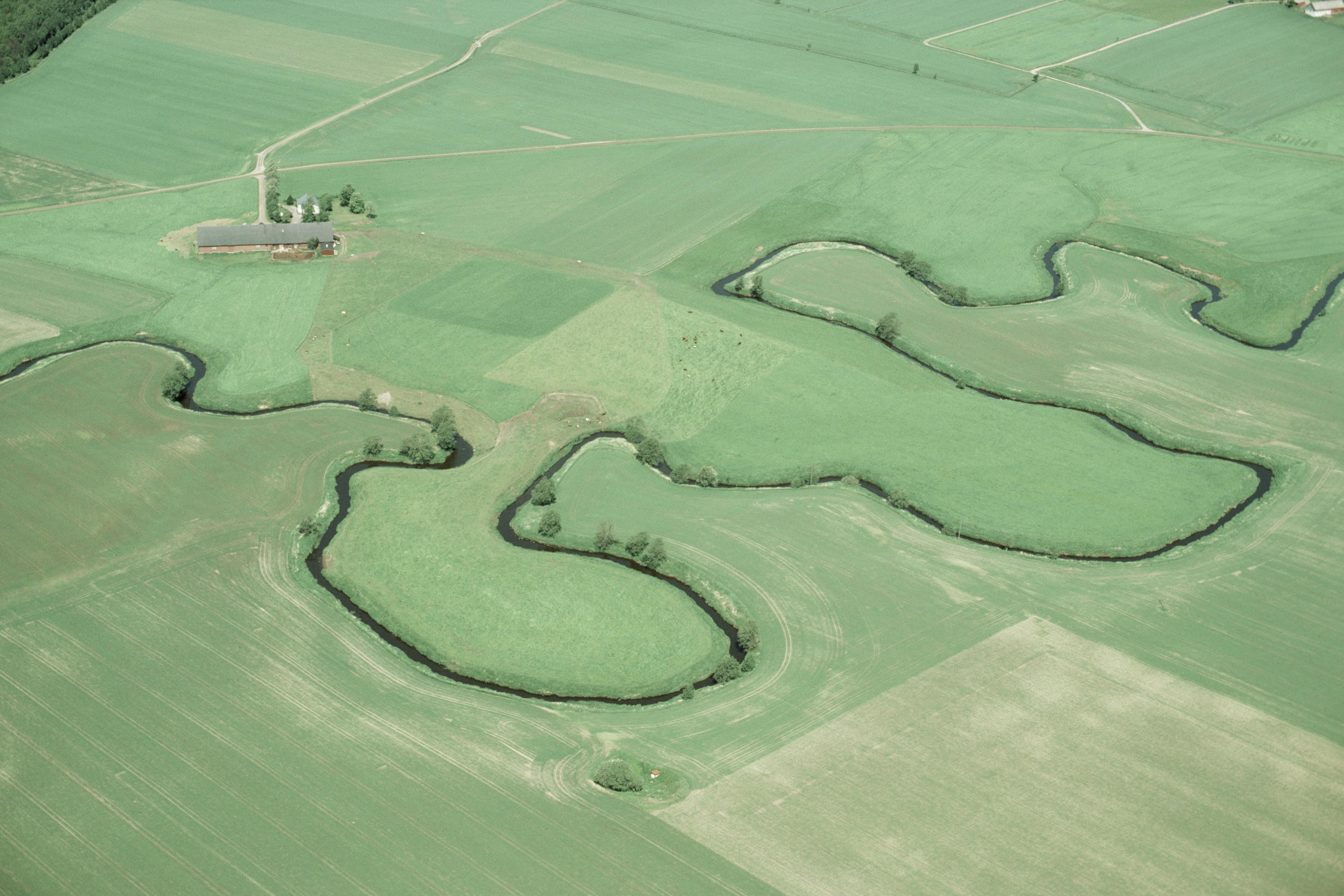 Beskrivning: Norra delen av Uddeholm. Meanderslingor i ån Surtan på gränsen mellan socknen Surteby-Kattunga och Fotskäl (i bildens övre del). Larsgården och fyndplats Fotskäl 71:1 uppe till vänster. Bilden är tagen mot (väderstreck): NNV