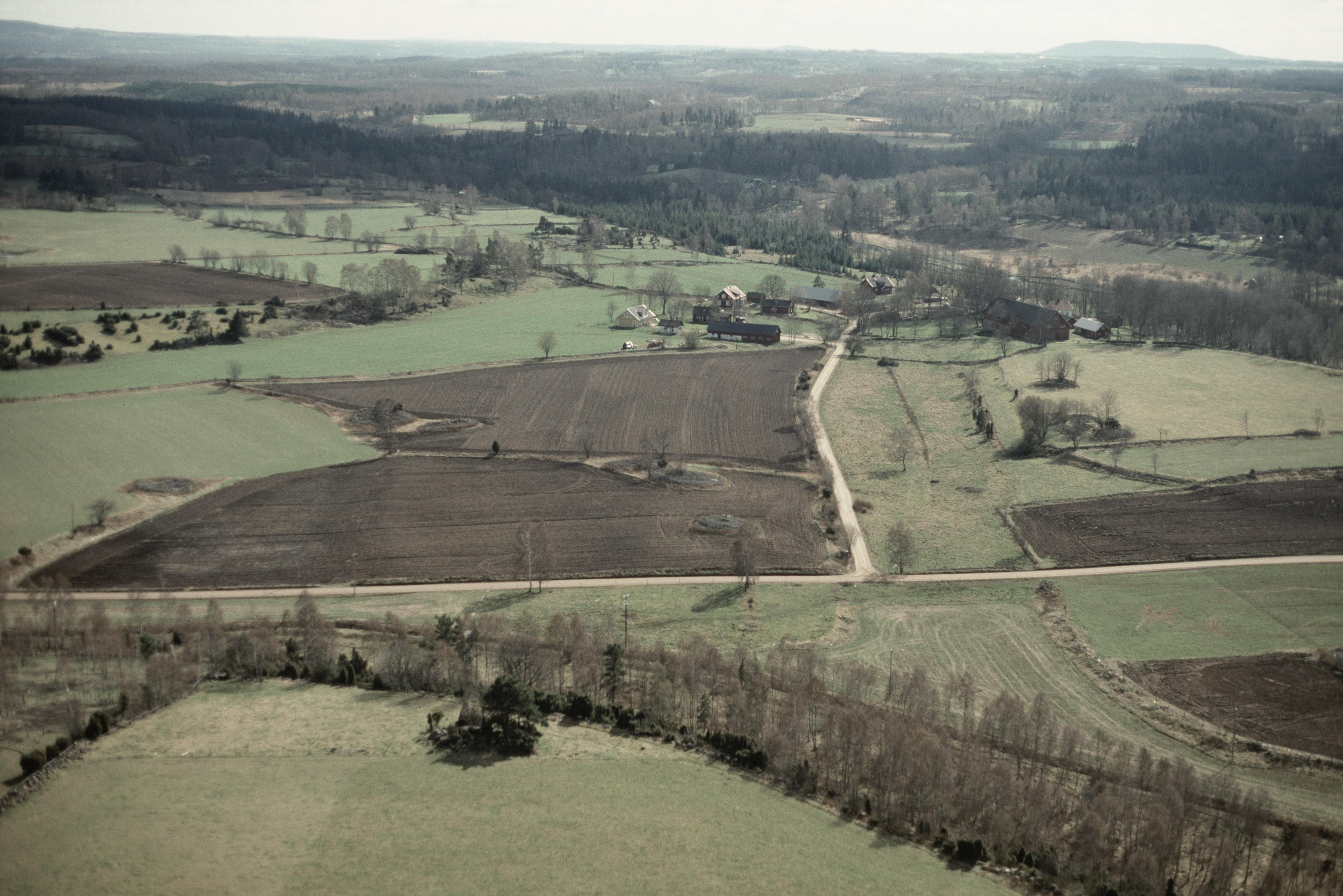 Beskrivning: Fossil åker RAÄnr 114.1 i bildens nedre del. Röse RAÄnr Håkanstorp 14:1 vid bildens mitt. Nolgården i bildens övre del. Bilden är tagen mot (väderstreck): SO