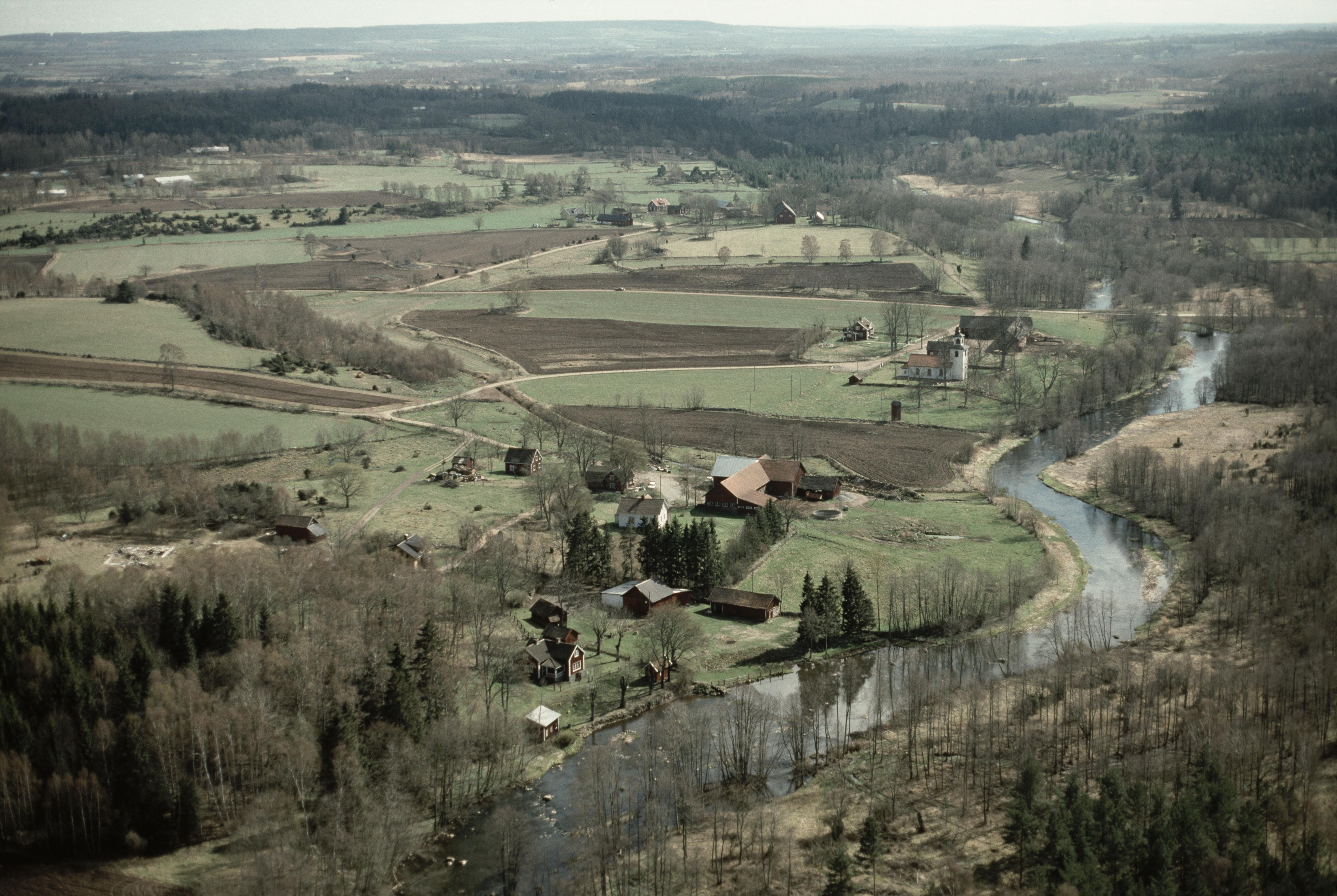 Beskrivning: Arvid-Jonsgården under bildens mitt. Håkantorps kyrka vid ån Slafsan till höger. I bildens övre del fossila åkrar RAÄnr Håkantorp 114:1, 143:1 m.fl. Bilden är tagen mot (väderstreck): SO