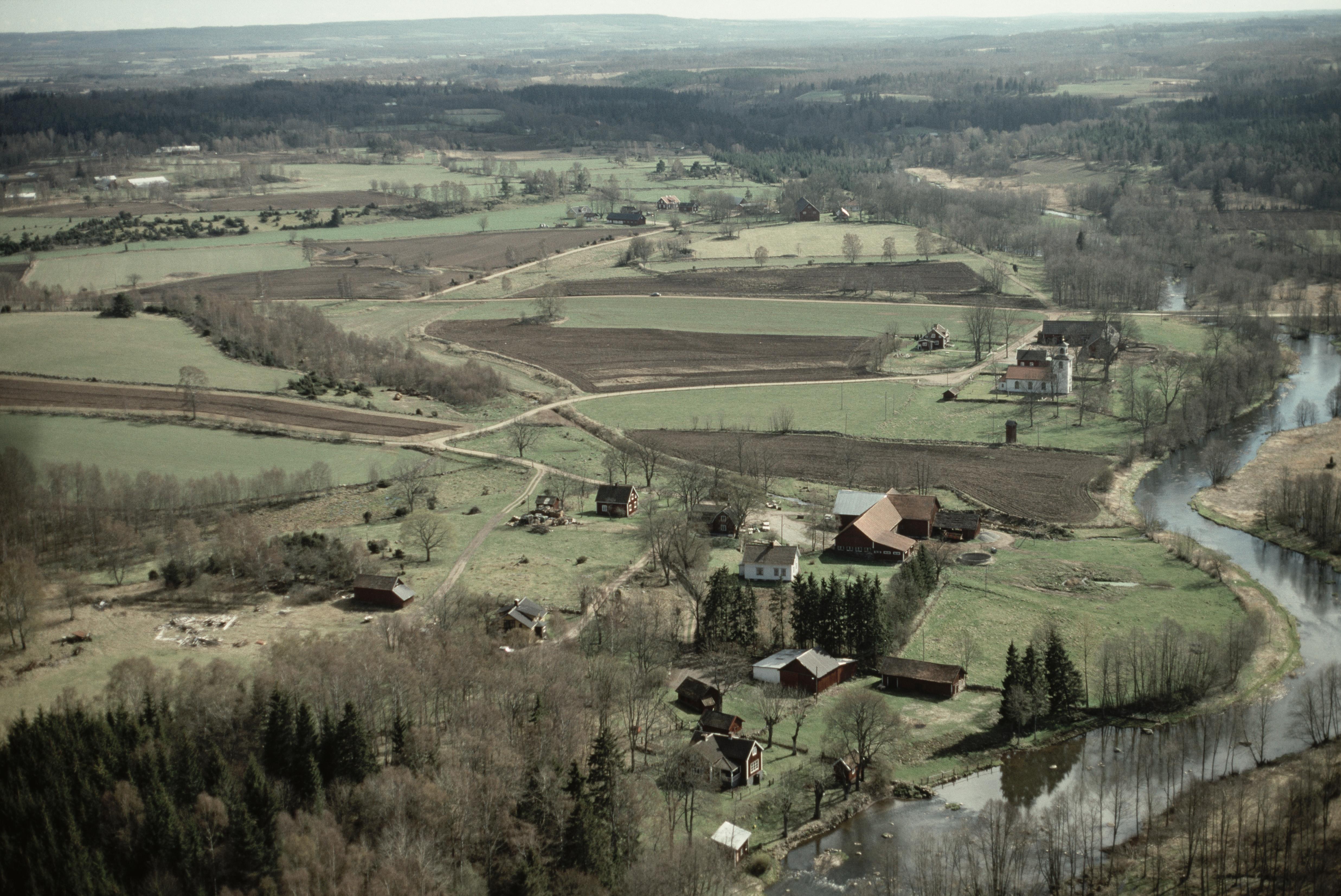 Beskrivning: Arvid-Jonsgården under bildens mitt. Håkantorps kyrka vid ån Slafsan till höger. I bildens övre del fossila åkrar RAÄnr Håkantorp 114:1, 143:1 m.fl. Bilden är tagen mot (väderstreck): SO