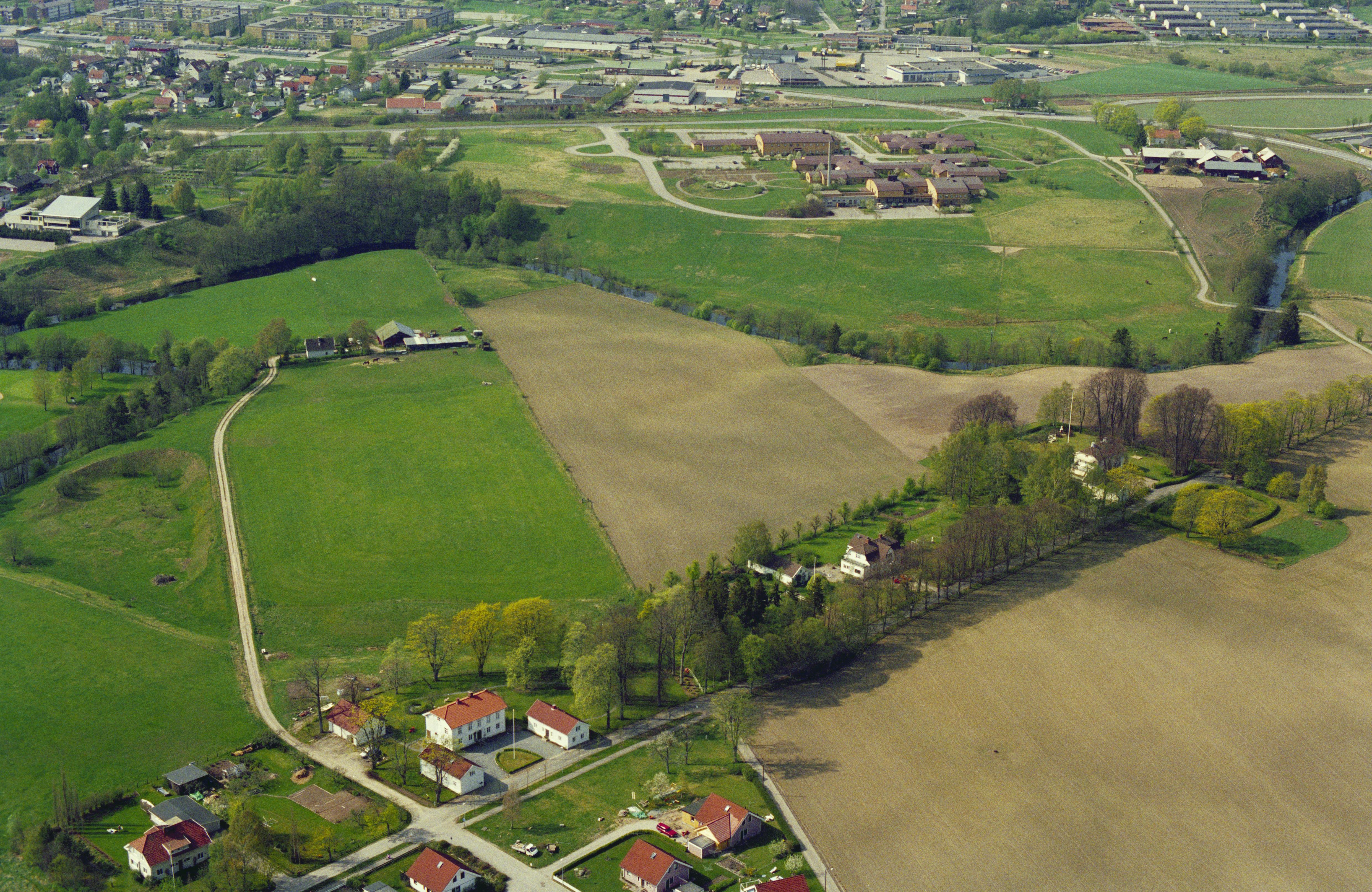 Beskrivning: Häggån i Häggådalen på gränsen mellan socknen Örby och Kinna (uppe till vänster). Förläggargårdar. Haga gård vid bildens mitt. Kinna tätort uppe till vänster. Bilden är tagen mot (väderstreck): NV