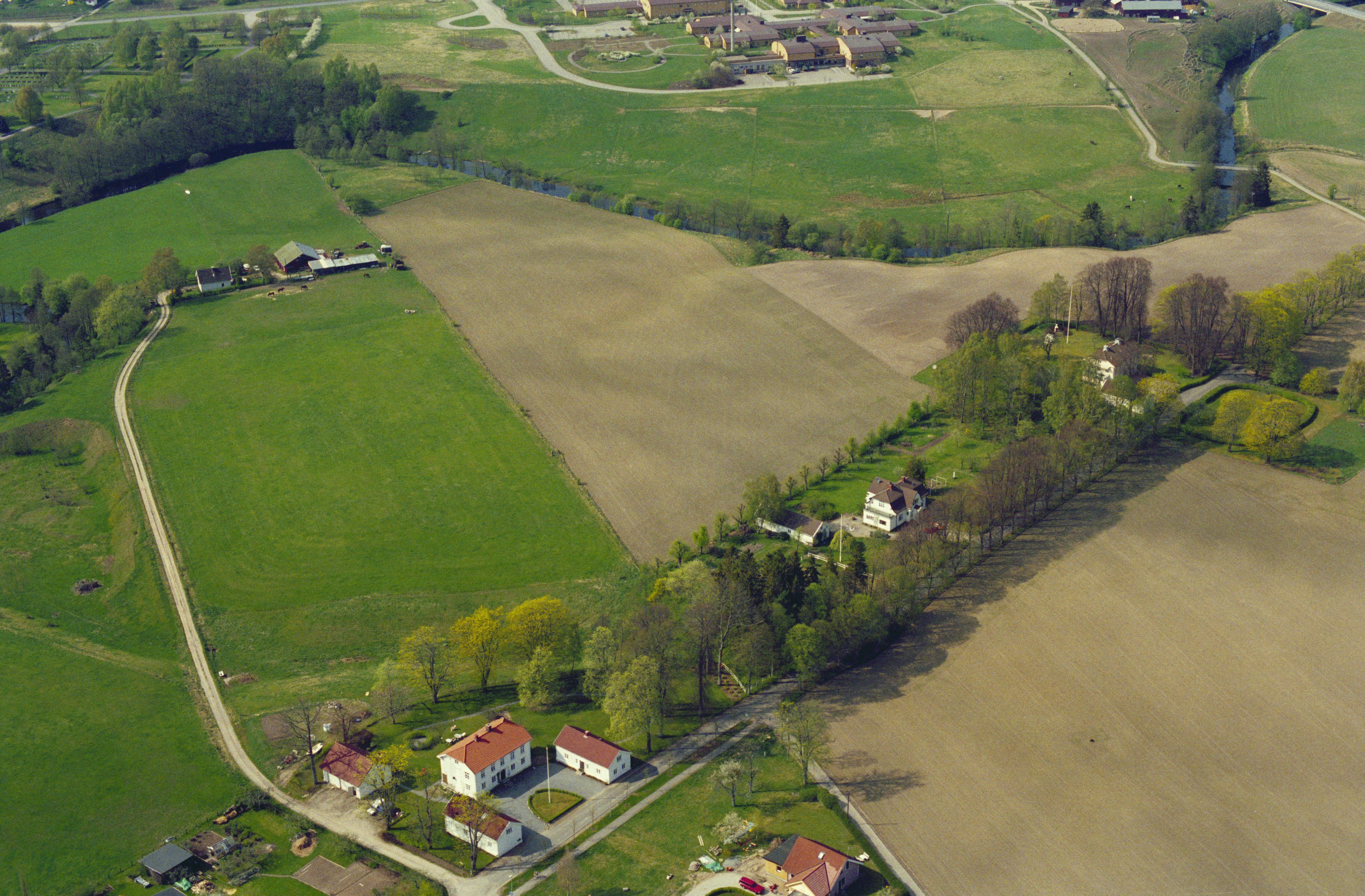 Beskrivning: Häggån i Häggådalen på gränsen mellan socknen Örby och Kinna (uppe till vänster). Förläggargårdar. Haga gård vid bildens mitt. Kinna tätort uppe till vänster. Bilden är tagen mot (väderstreck): NV