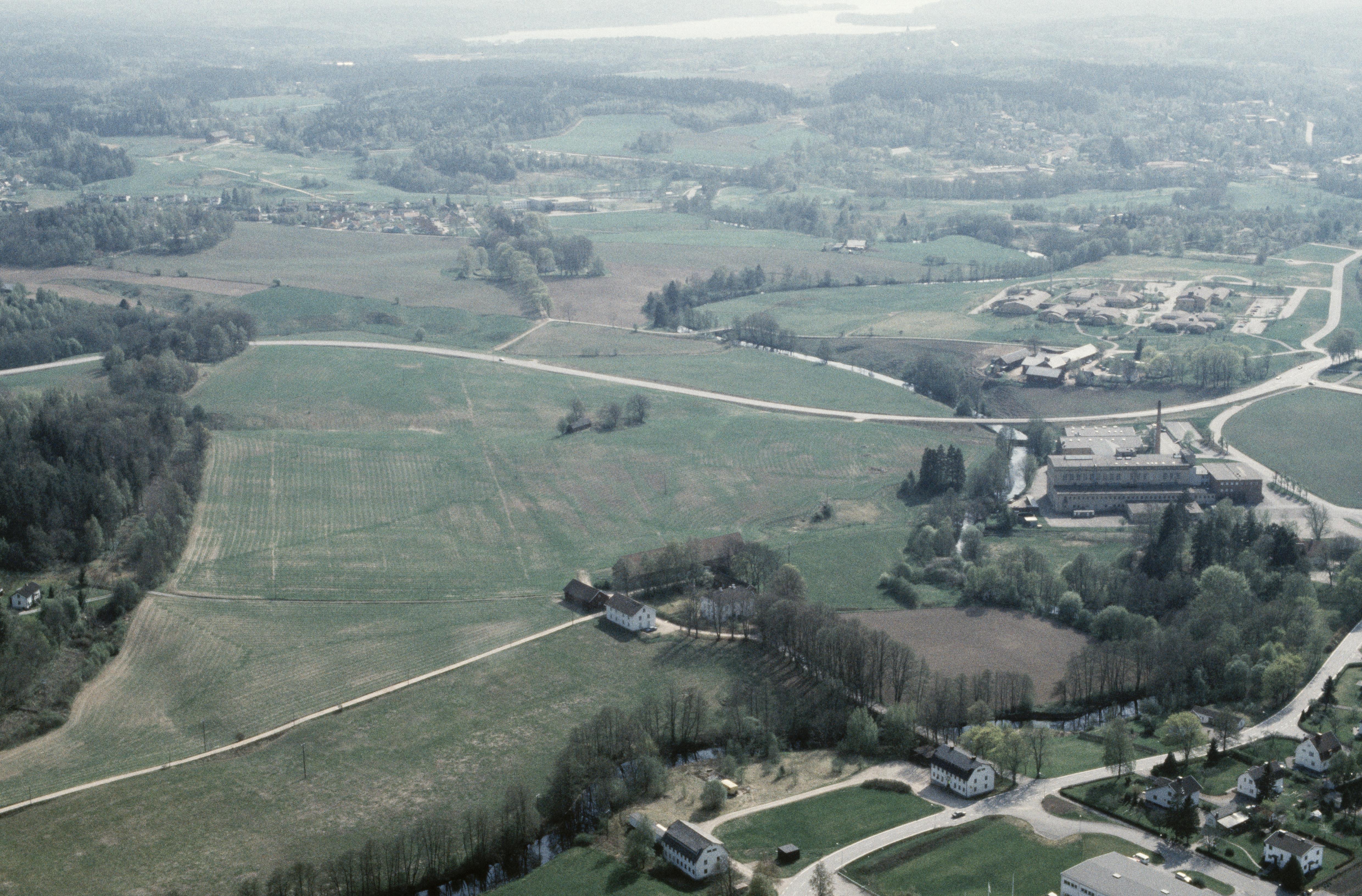Beskrivning: Häggån i Häggådalen på gränsen mellan socknen Kinna och Örby (i bildens övre del). Förläggargårdar. Haga gård i Örby socken vid bildens mitt. Bilden är tagen mot (väderstreck): S