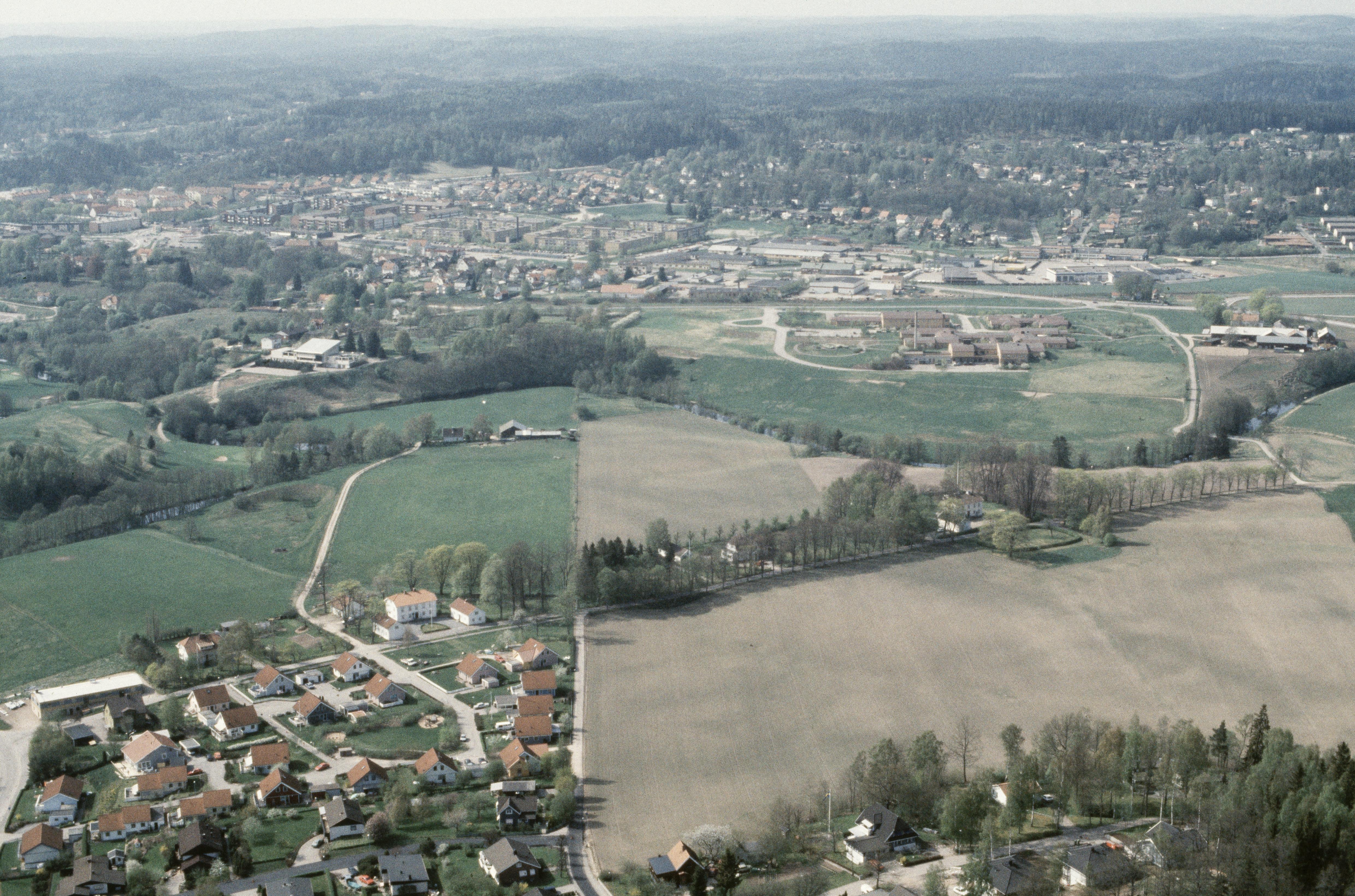 Beskrivning: Häggån i Häggådalen på gränsen mellan socknen Örby och Kinna (uppe till vänster). Förläggargårdar. Haga gård vid bildens mitt. Kinna tätort uppe till vänster. Bilden är tagen mot (väderstreck): NV