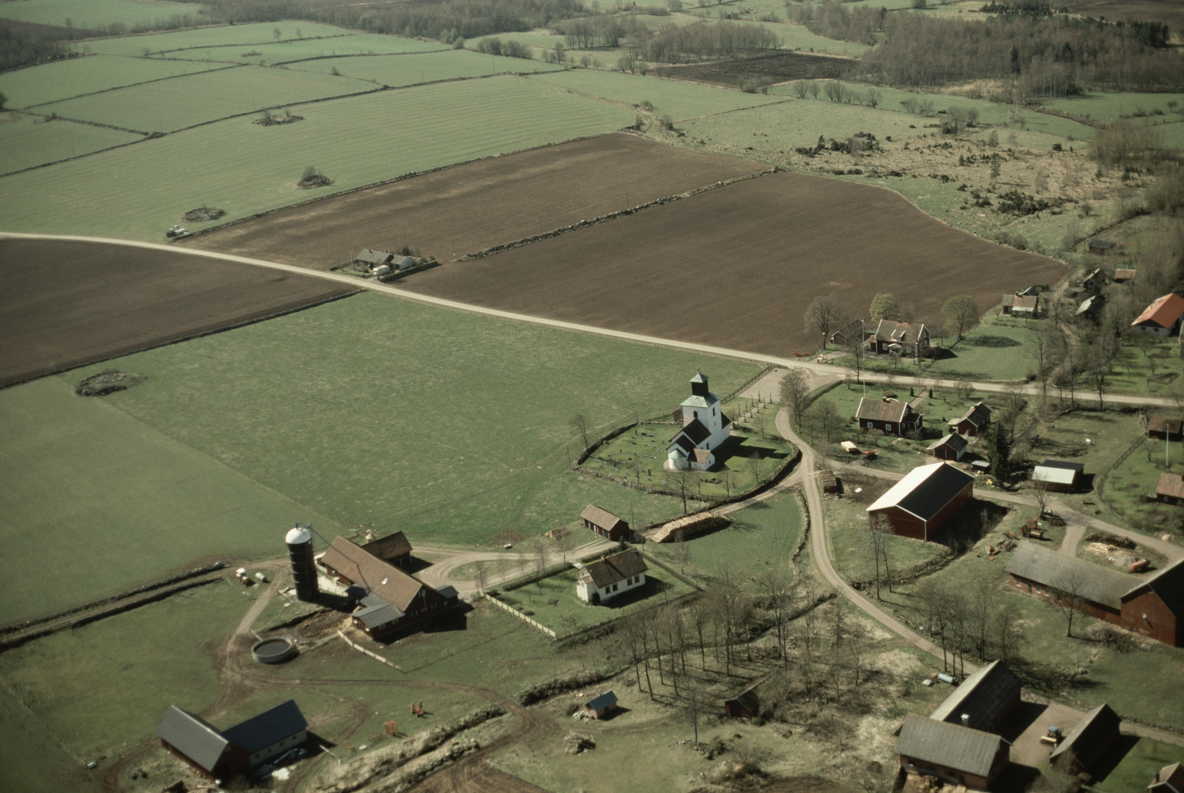 Beskrivning: Mularps kyrka och kyrkby. Bilden är tagen mot (väderstreck): VSV