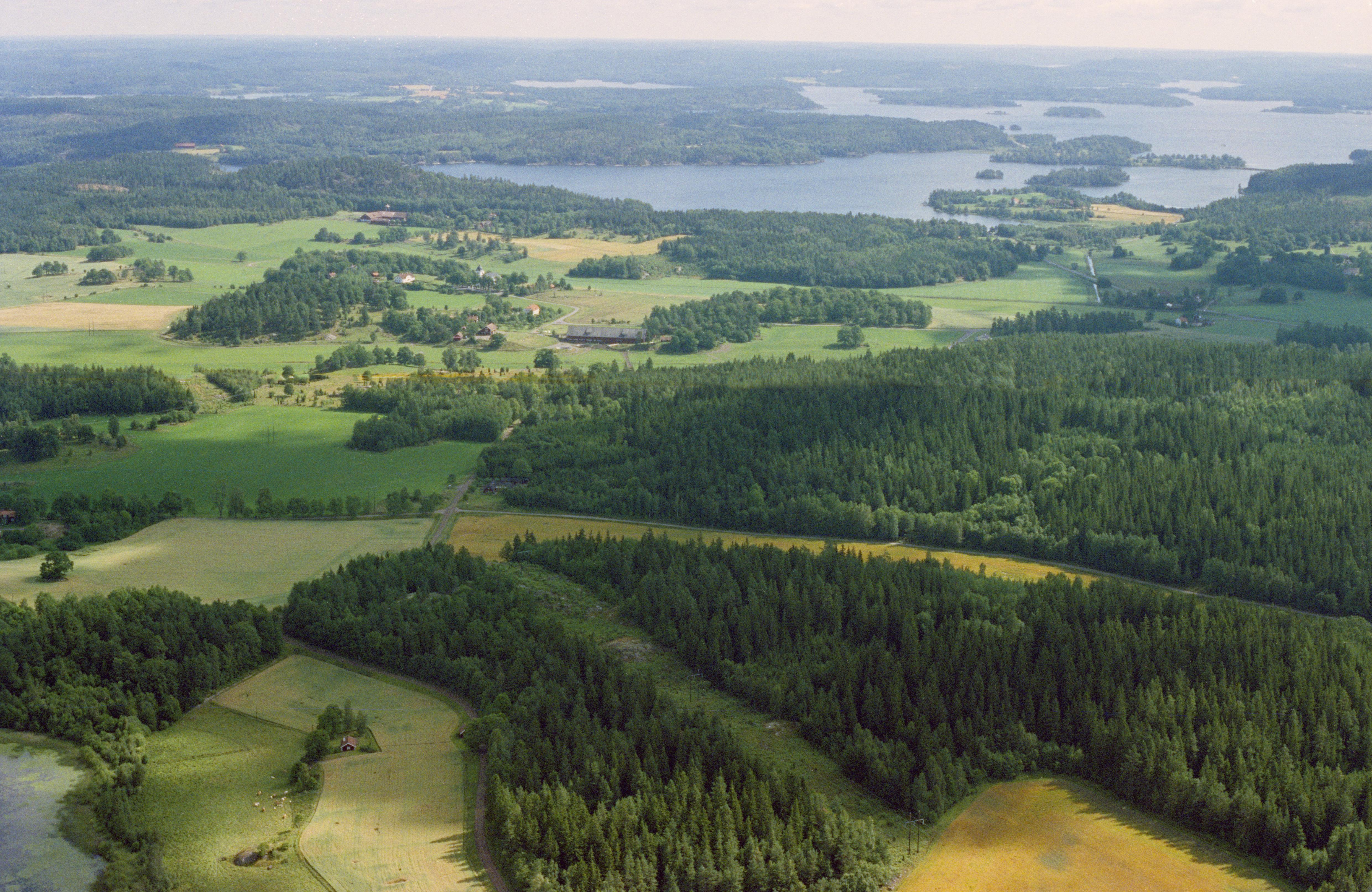 Beskrivning: Nere till vänster Adlerskog. Västra Eneby kyrka till vänster vid bildens mitt. I bildens övre del sjön Åsunden. Bilden är tagen mot (väderstreck): NO