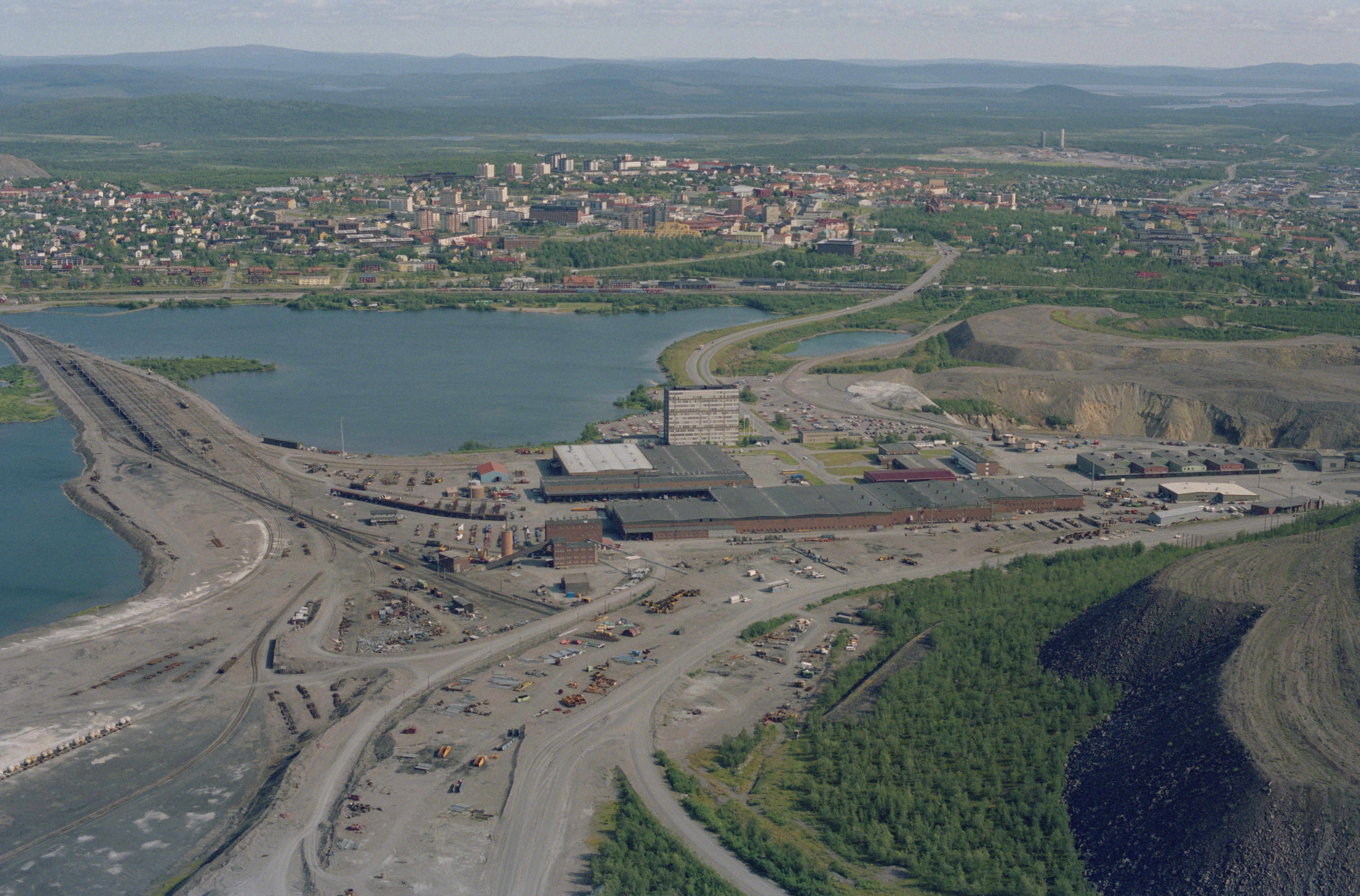 Beskrivning: Kiruna (Giron) tätort och gruvsamhälle. Gruvfjället Kiirunavaara (Kirunavaara / Gironvárri) vid sjön Luossajärvi. Till höger över bildens mitt Kiruna stadshus, Kiruna kykra och minnesmärke RAÄnr Jukkasjärvi 159:1. Bilden är tagen mot (väderstreck): OSO