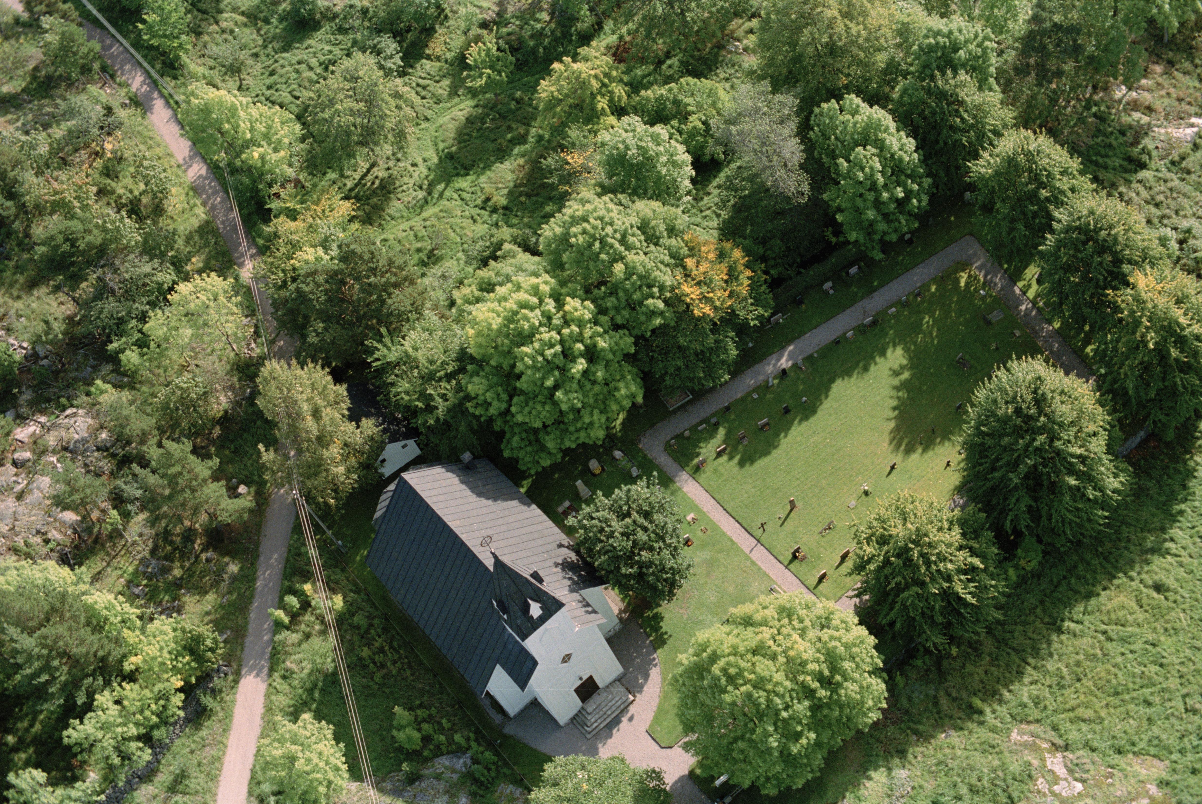 Beskrivning: Ön Nämdö, sydvästra delen. Nämdö kyrka och prästgård vid Orröströmmen i Nämdöfjärden. Bilden är tagen mot (väderstreck): OSO