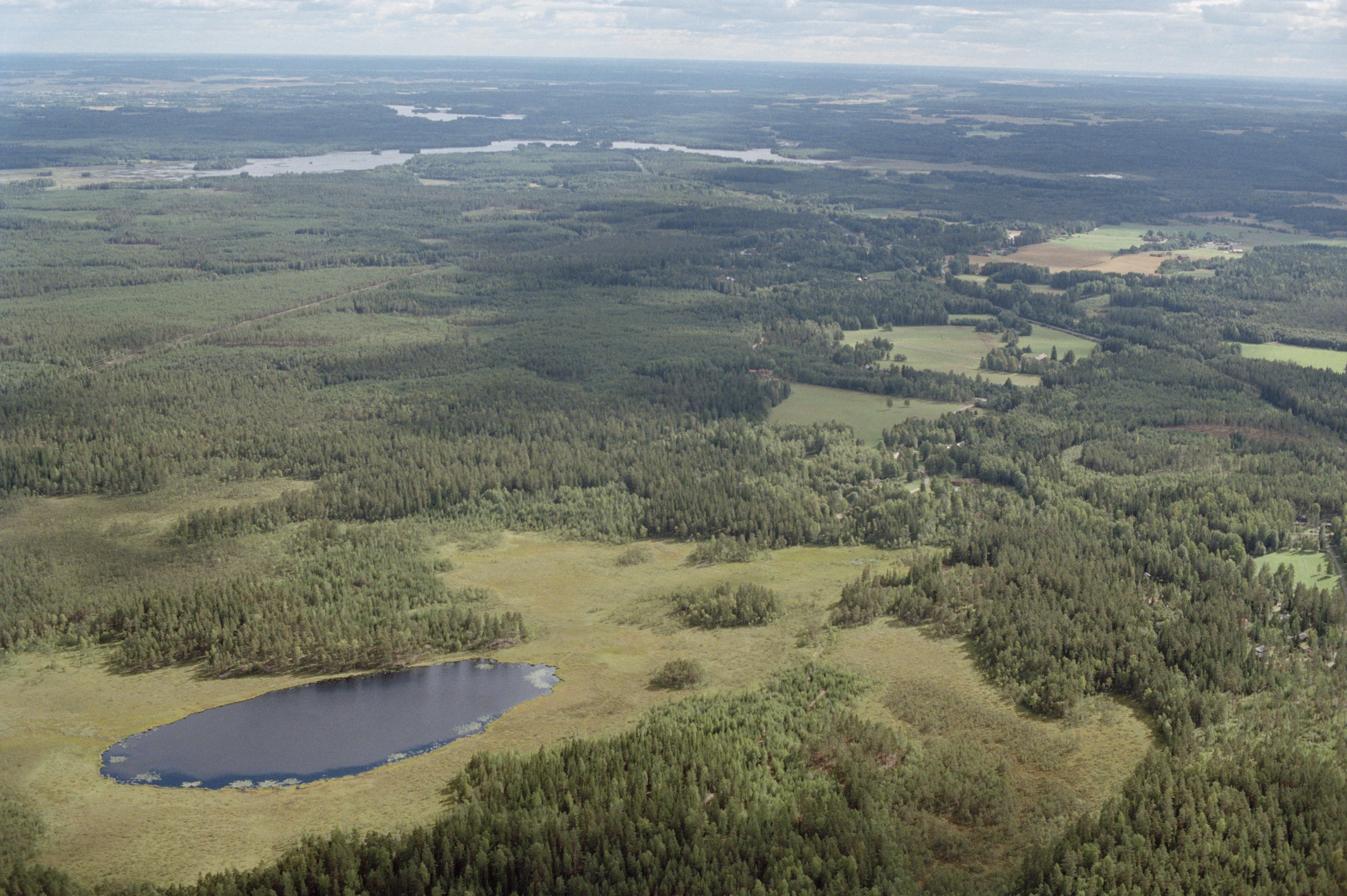 Beskrivning: Storljusbäckens dalgång norrost om Rensmurs by. Björksjön i Björksjö mosse nere till vänster. Under bildens mitt kolningsanläggningar RAÄnr Möklinta 298:1 och 333;1. Vid bilden mitt gräns mot Sala stads socken och Sala socken. I bildens övre del Sala gruvdammar Olof-Jons damm och Silvköparen. Bilden är tagen mot (väderstreck): SO