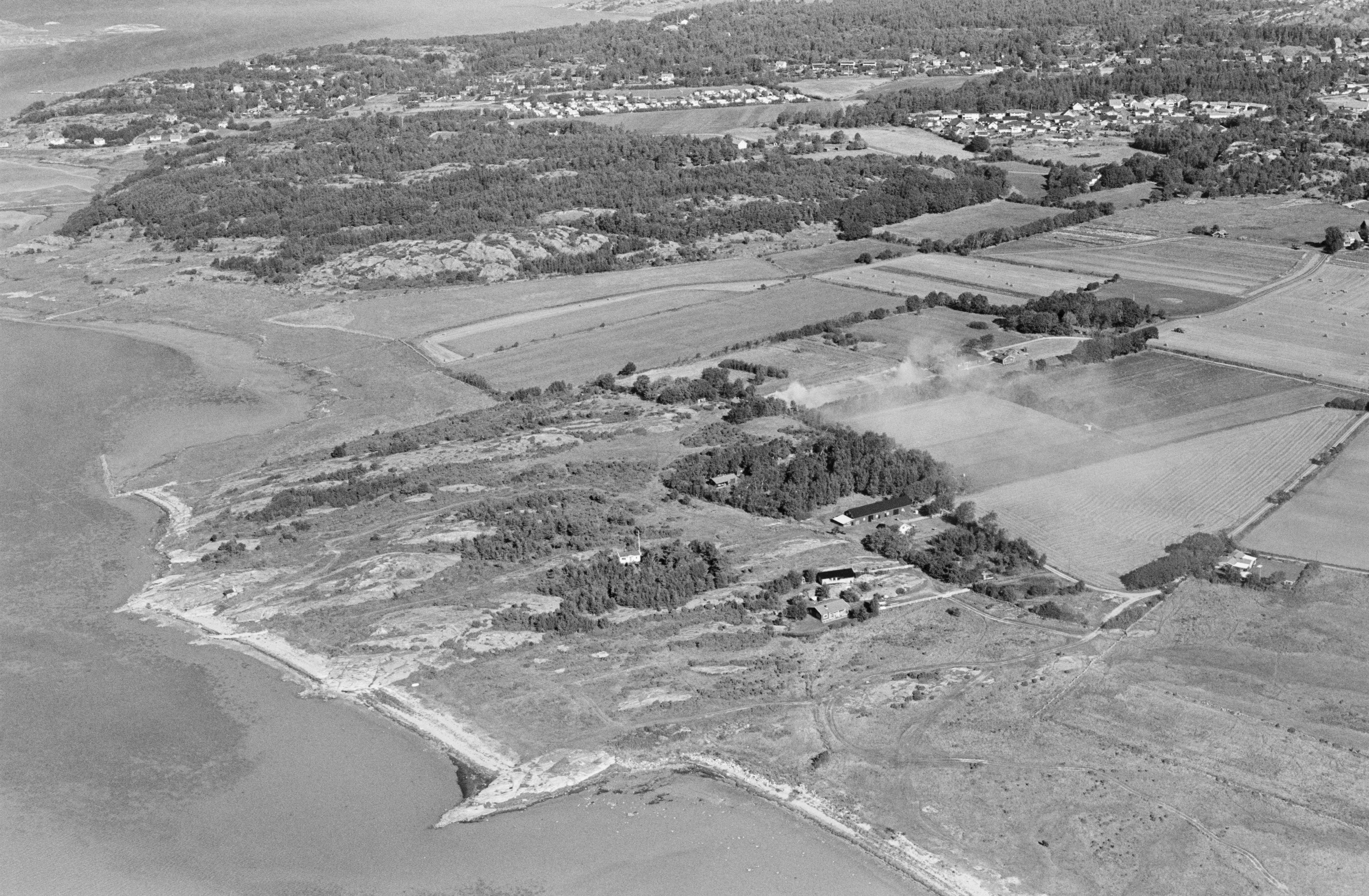Beskrivning: Norra Anrås. Gravfält RAÄnr Jörlanda 58:1 vid Anråse åns mynning (nere till höger) i Hake fjord. I bildens övre del byn Stora Höga. Bilden är tagen mot (väderstreck): NO