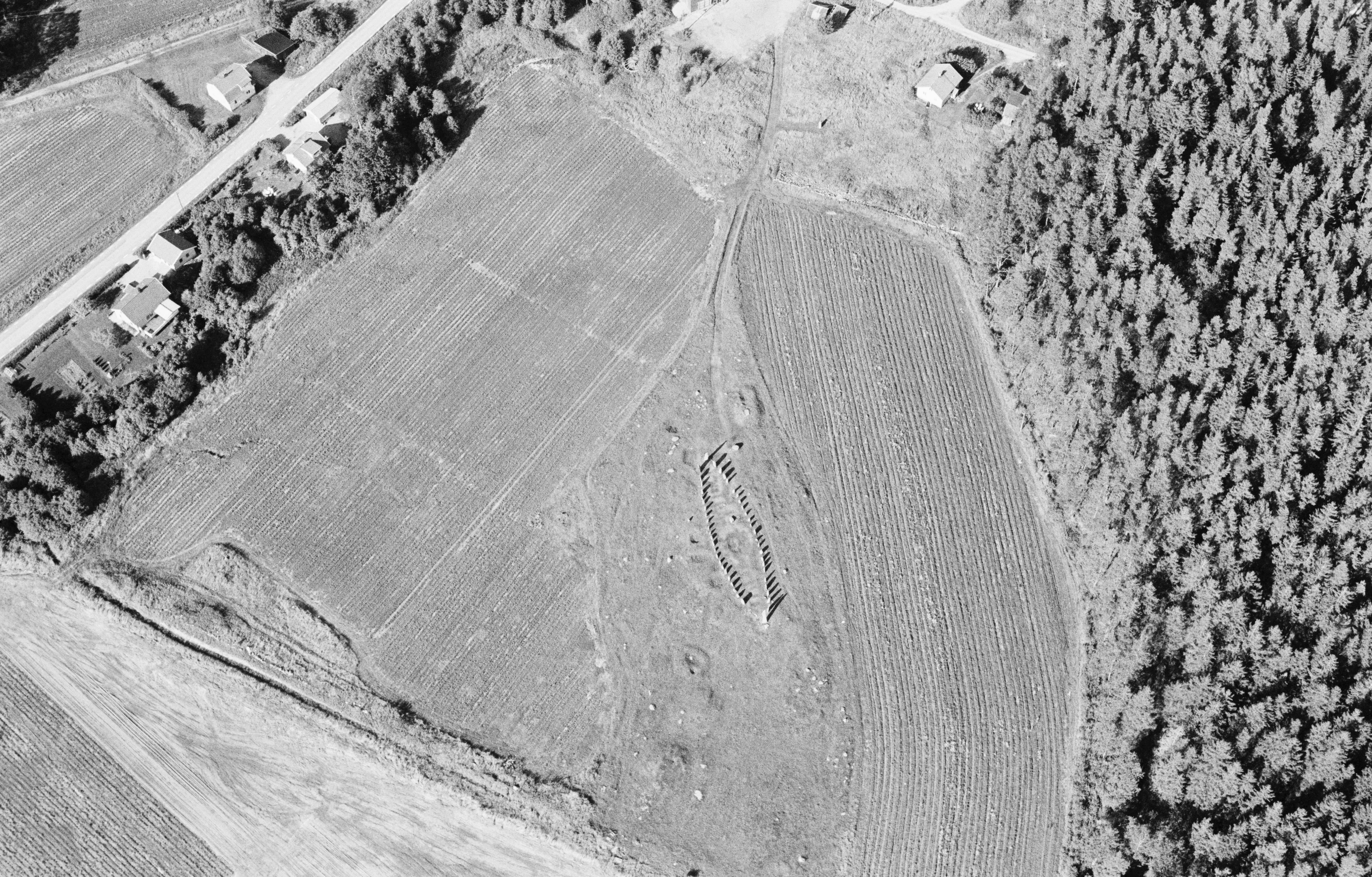 Beskrivning: Blomsholms by och herrgård. Gravfält med skeppssättning RAÄnr Skee 343:1 och hällristning Skee 1563:1 till höger om bildens mitt. Bilden är tagen mot (väderstreck): N