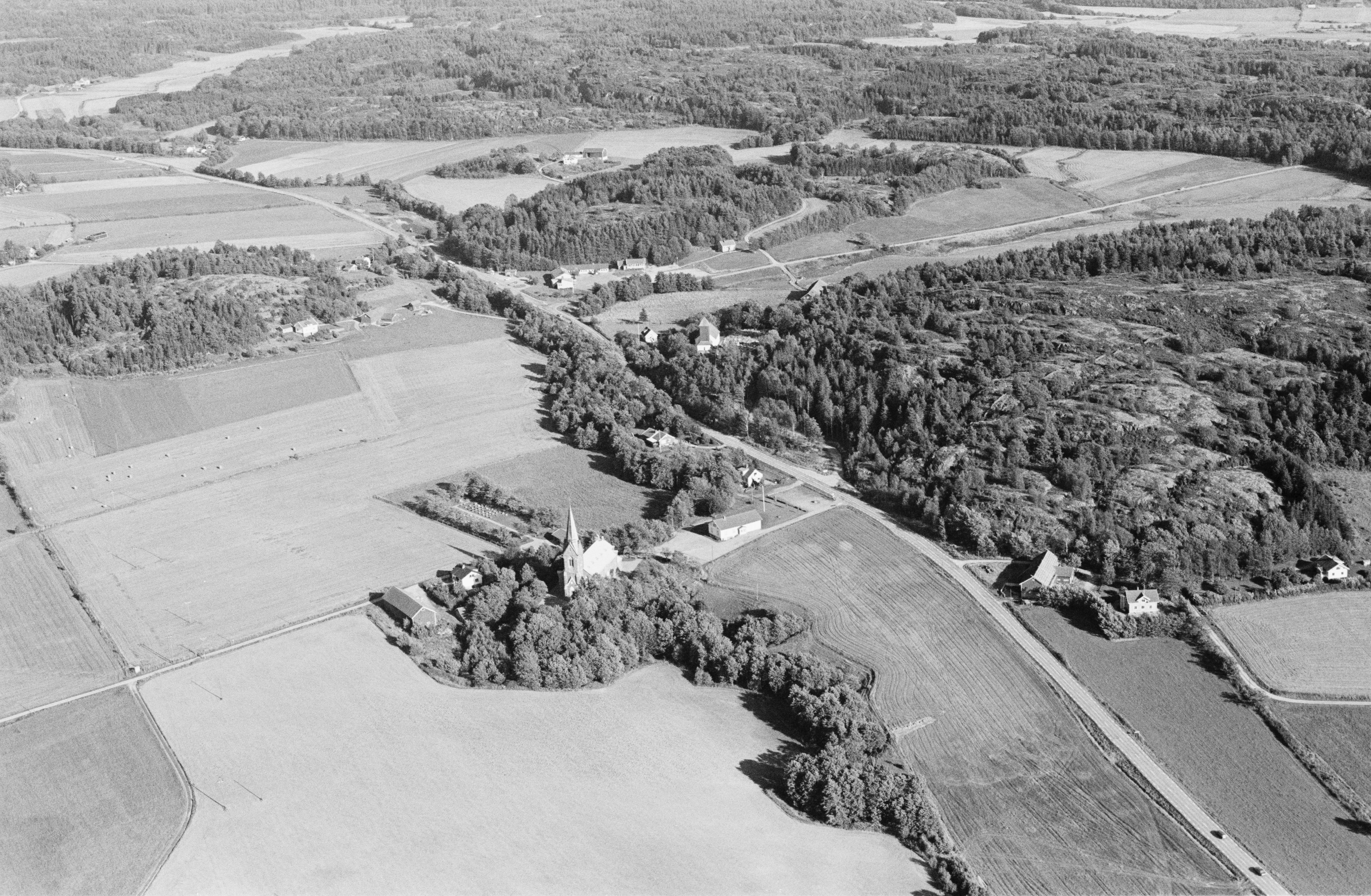 Beskrivning: Bokenäs nya kyrka till vänster, Bokenäs gamla kyrka till höger. Fornlämningar (bl.a. en boplats) RAÄnr Bokenäs 217:1 och 218:1. Bilden är tagen mot (väderstreck): Ö