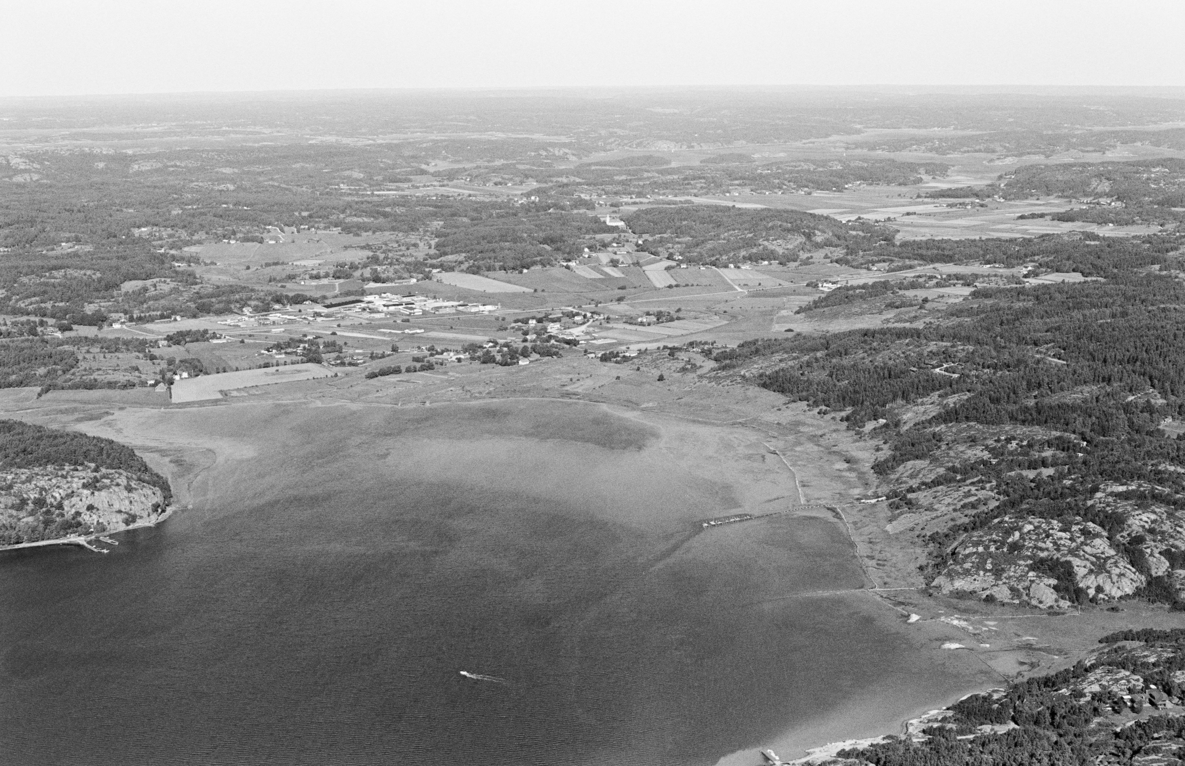 Beskrivning: Havsviken Svanviks kile vid Balkevik, Svanvik och Röd på ön Tjörn, med boplats RAÄnr Valla 268:1 nere till höger. Valla kyrka i bildens övre del. Bilden är tagen mot (väderstreck): N