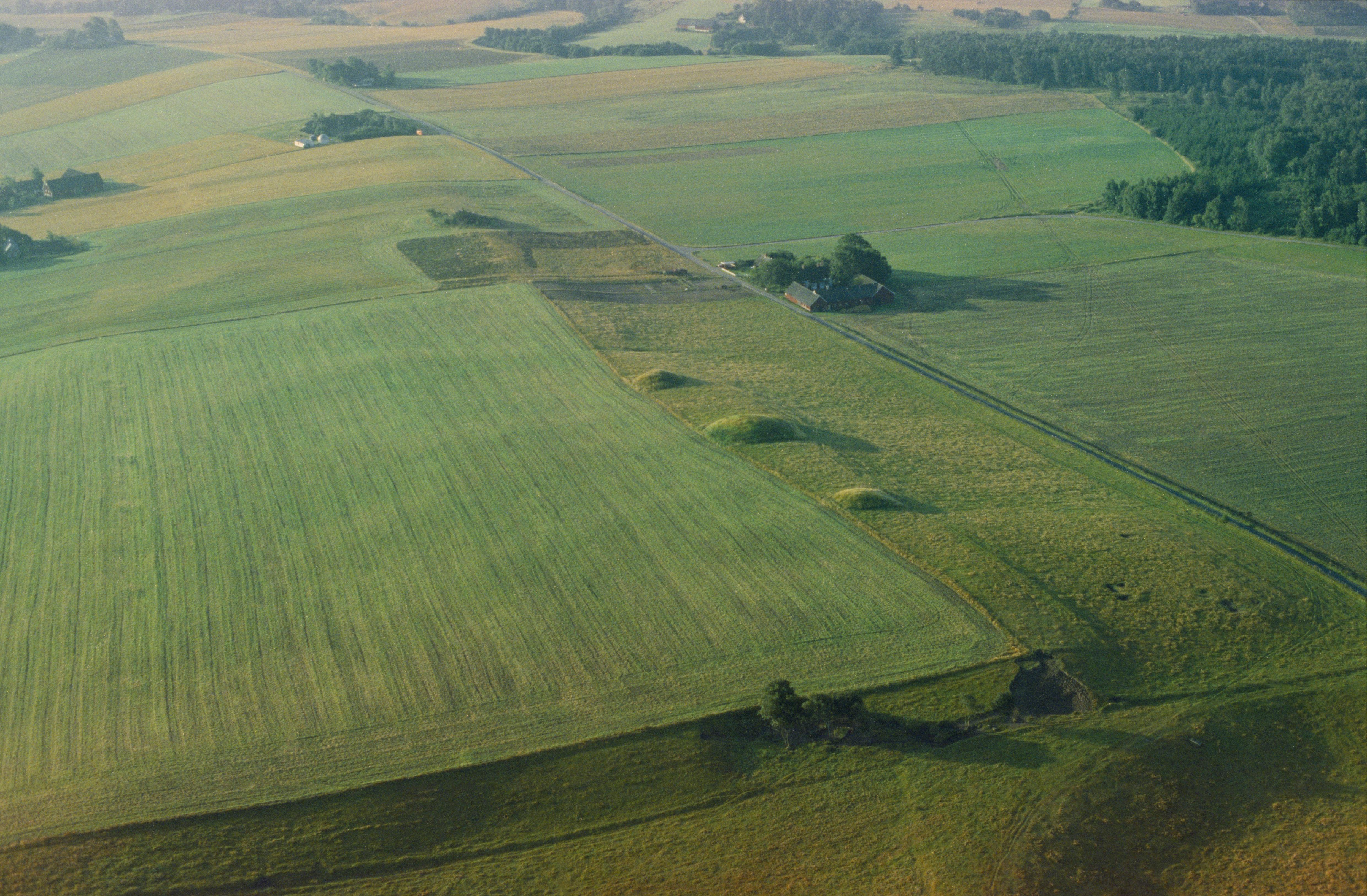Truedsgården. Gravhögar RAÄnr Eldsberga 2:1, 3:1, 4:1 m.fl. vid bildens mitt. Bilden är tagen mot (väderstreck): S