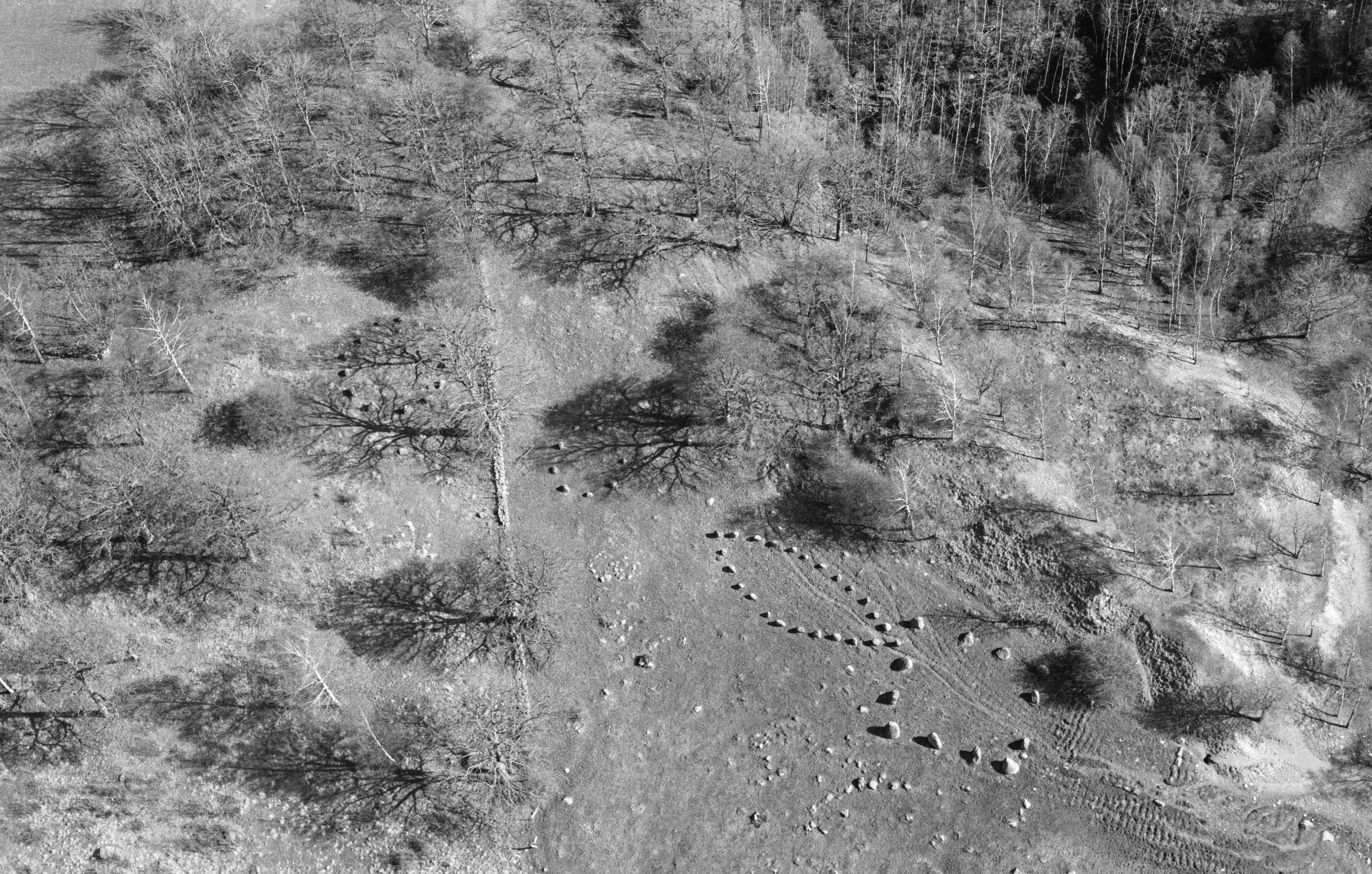 Beskrivning: (Skrivs även Amundstorp). Gravfält Biskopskullen. Högarna skeppssättning och domarring m.m. RAÄnr Norra Lundby 62:1. Bilden är tagen mot (väderstreck): OSO