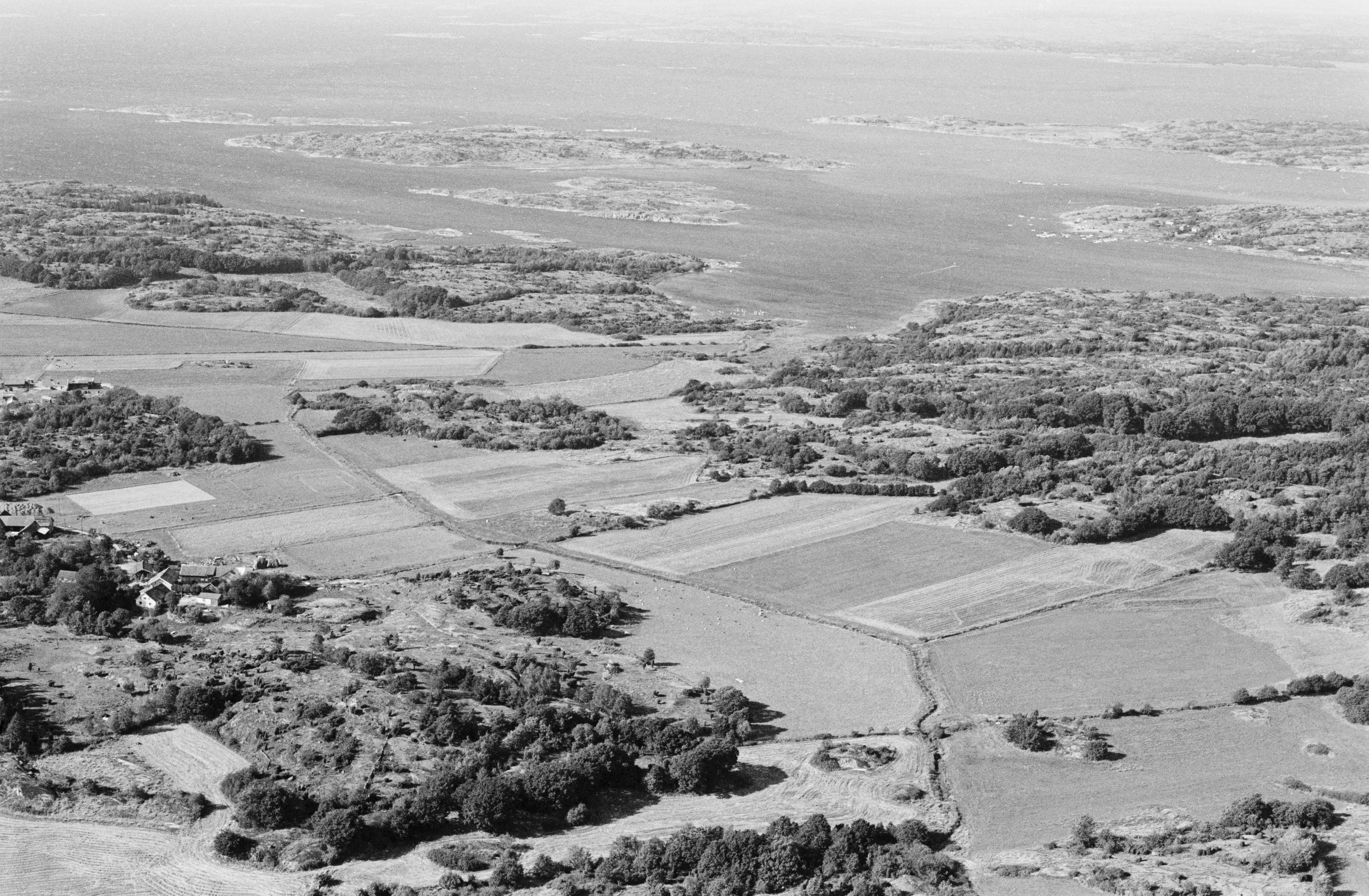 Beskrivning: Låssbybäcks dalgång. Bremsegården nere till vänster. Vid bildens mitt gravfält RAÄnr Björlanda 25:1. I bildens övre del StoraHästholmen i Prästgårdskilen. Bilden är tagen mot (väderstreck): NV