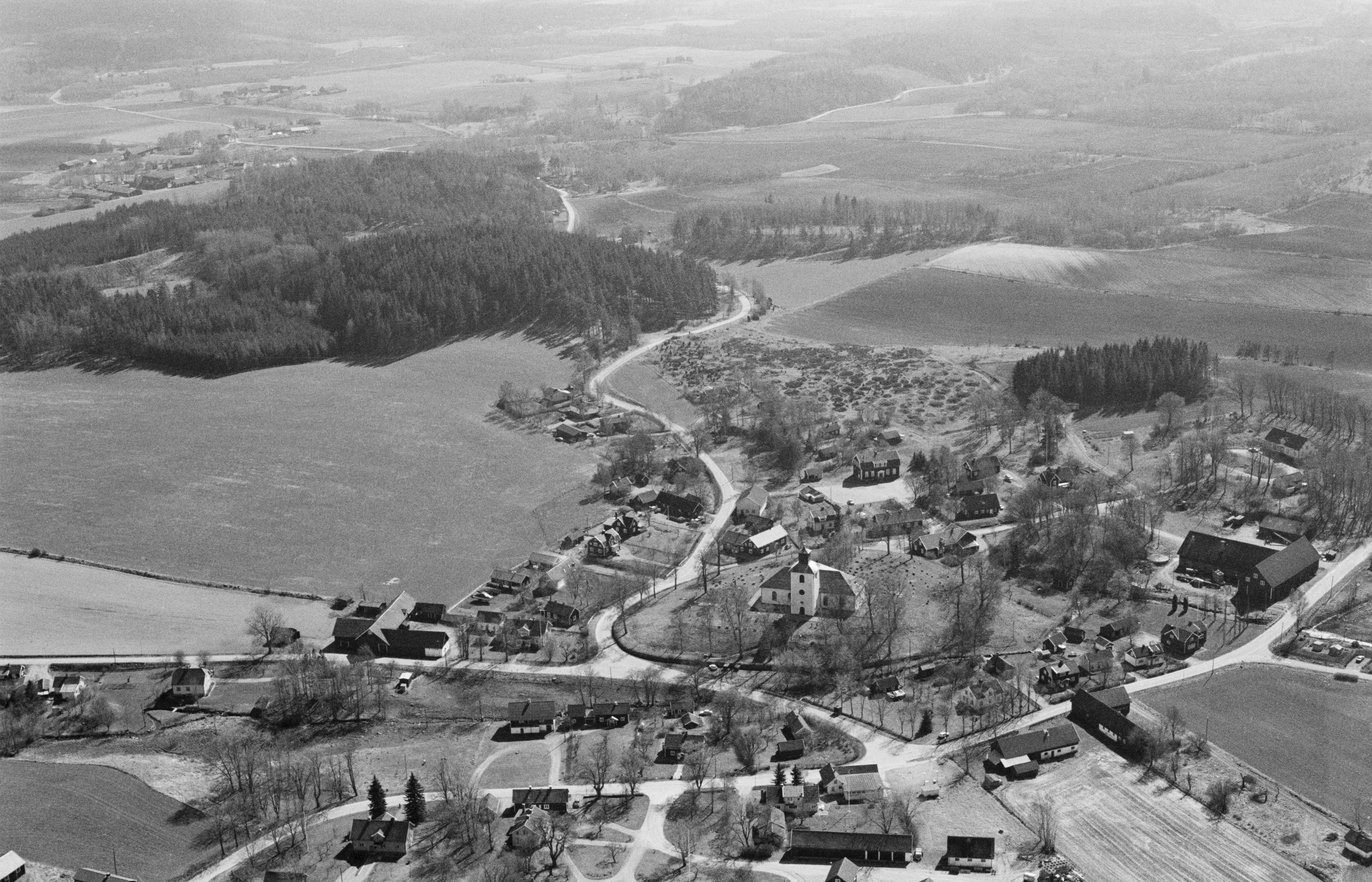Beskrivning: Dimbo kyrkby. Dimbo-Ottravads kyrka och gravfält RAÄnr Dimbo 6:1 vid bildens mitt. Bilden är tagen mot (väderstreck): SO
