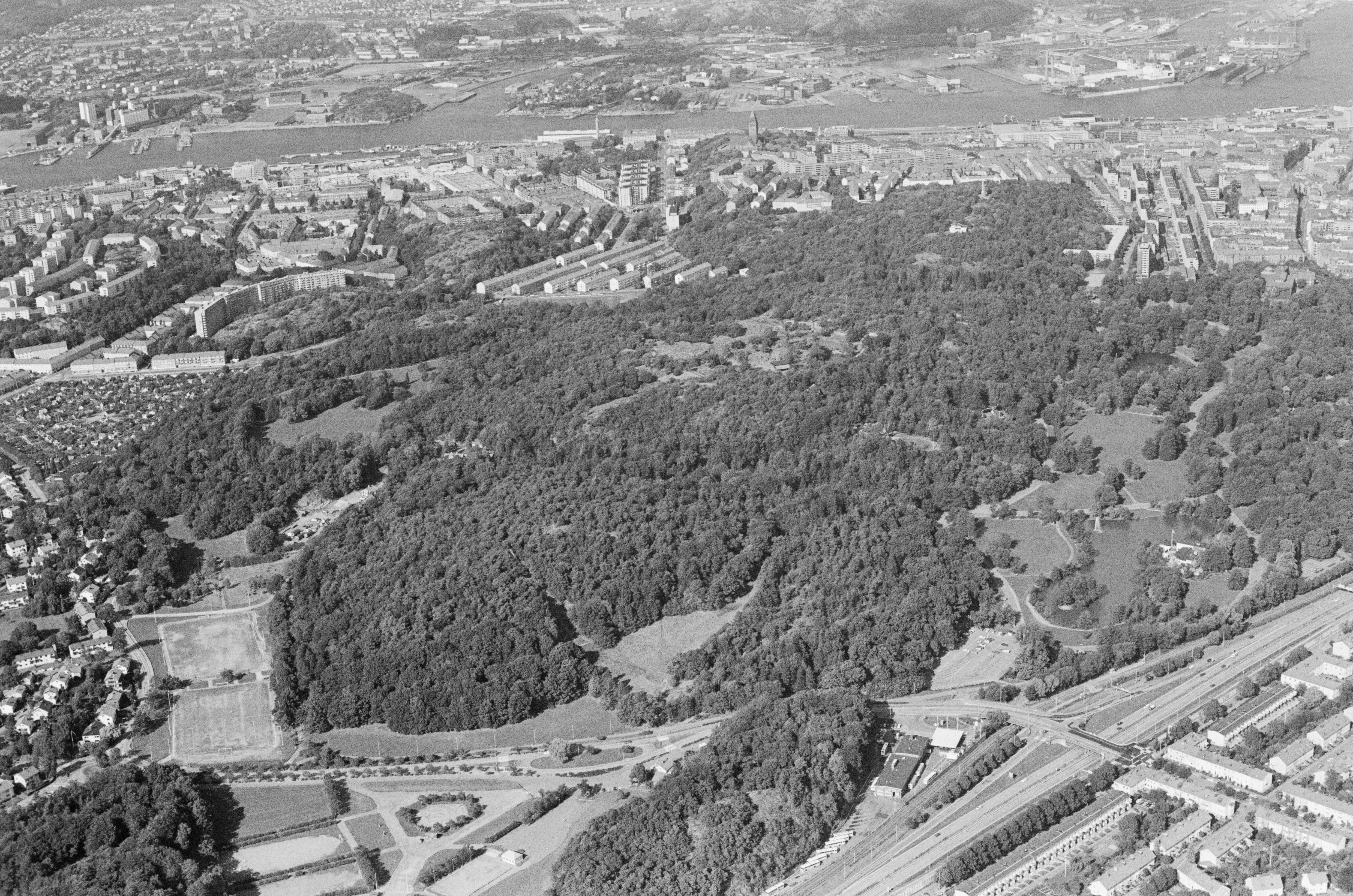 Beskrivning: Slottsskogen, en park och stadsdel sydväst om Göteborgs centrum. I bildens övre del Göteborgs stad, Göta älv, Masthugget, Masthuggskyrkan m.m. Bilden är tagen mot (väderstreck): NNO
