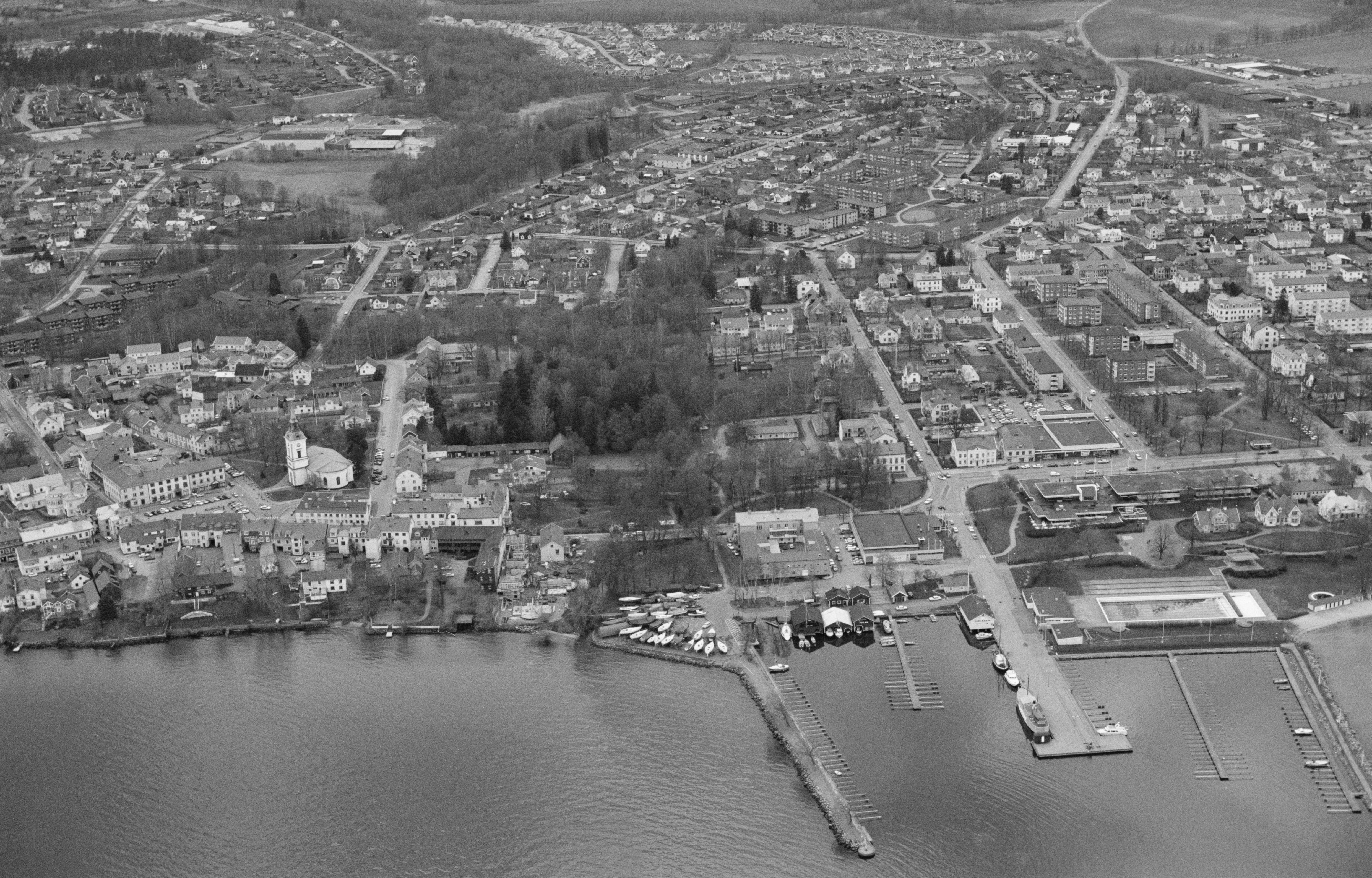 Beskrivning: Hjo stad vid sjön Vättern. Hjo kyrka nere till vänster om bildens mitt. Bilden är tagen mot (väderstreck): NV