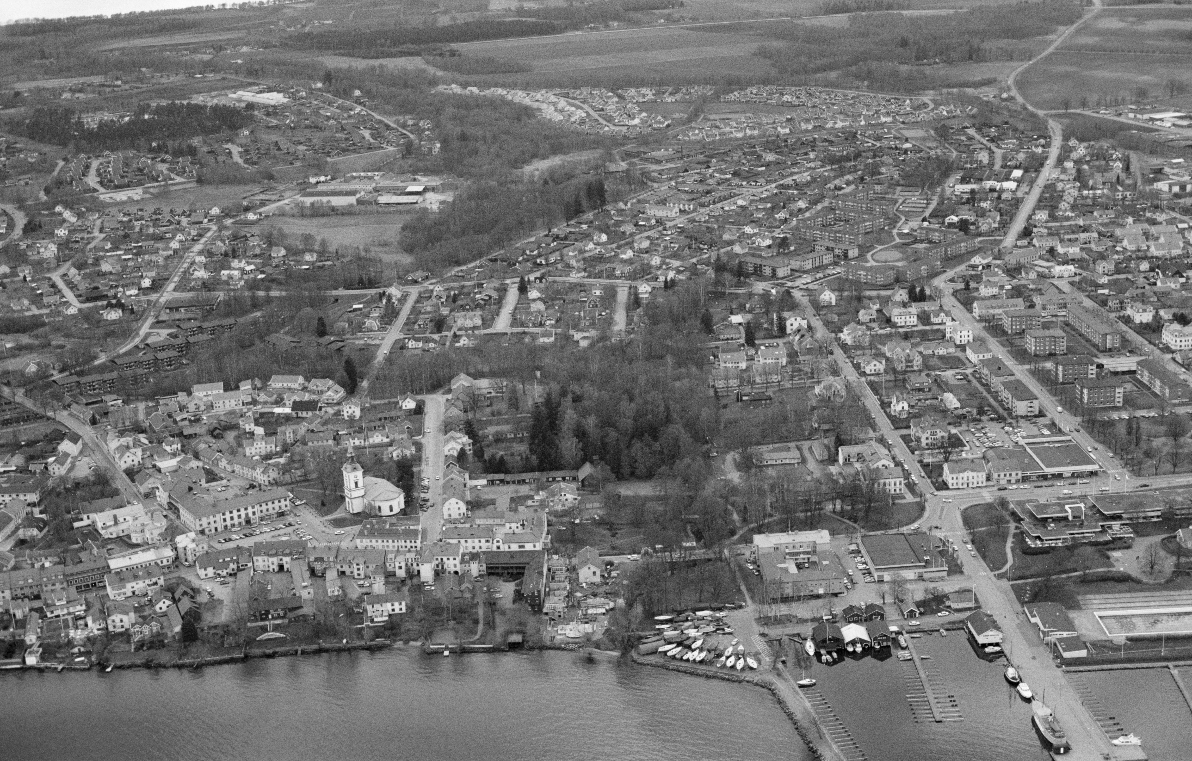 Beskrivning: Hjo stad vid sjön Vättern. Hjo kyrka nere till vänster om bildens mitt. Bilden är tagen mot (väderstreck): NV
