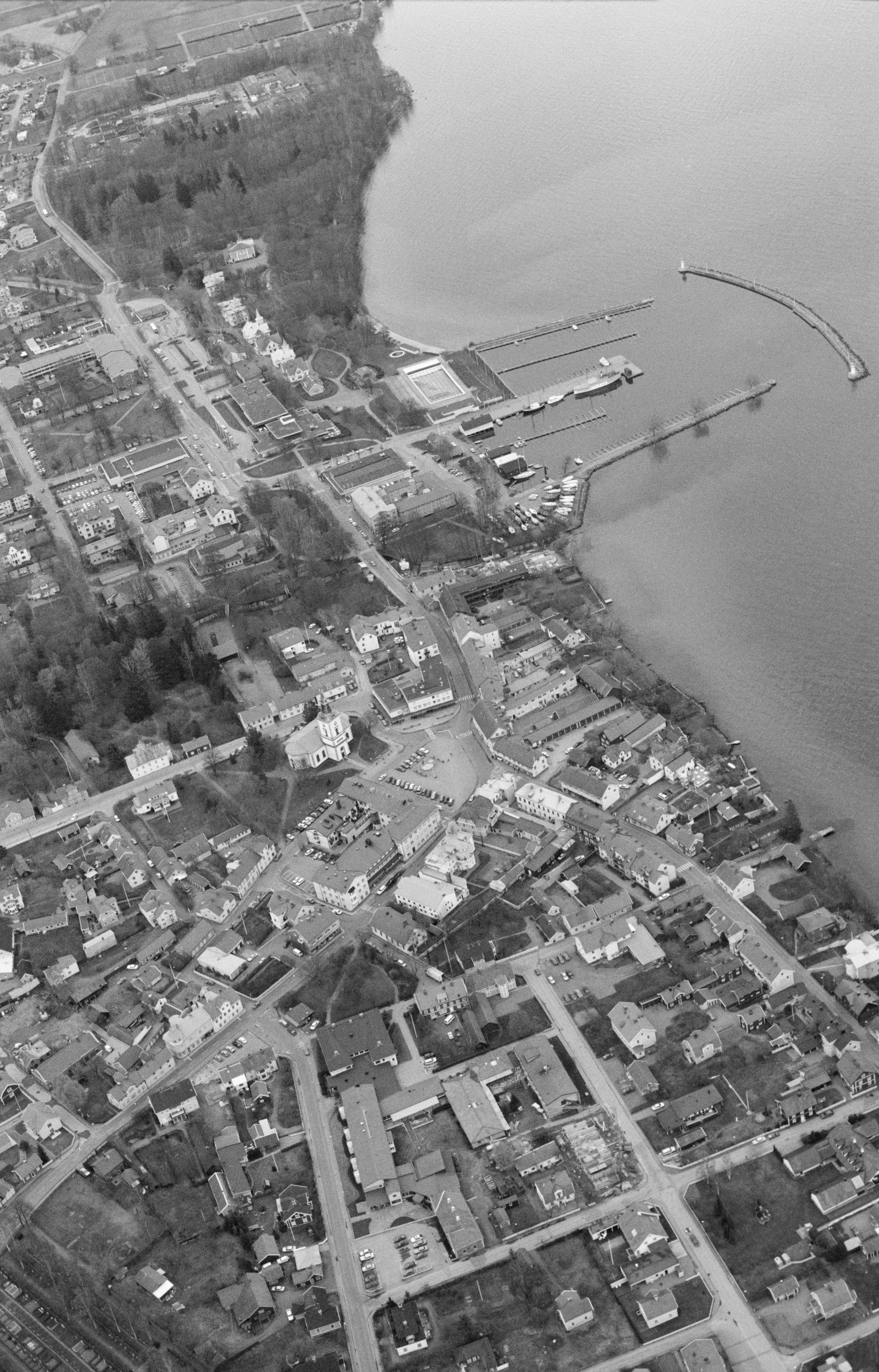 Beskrivning: Hjo stad vid sjön Vättern. Hjo kyrka vid bildens mitt. Bilden är tagen mot (väderstreck): NO