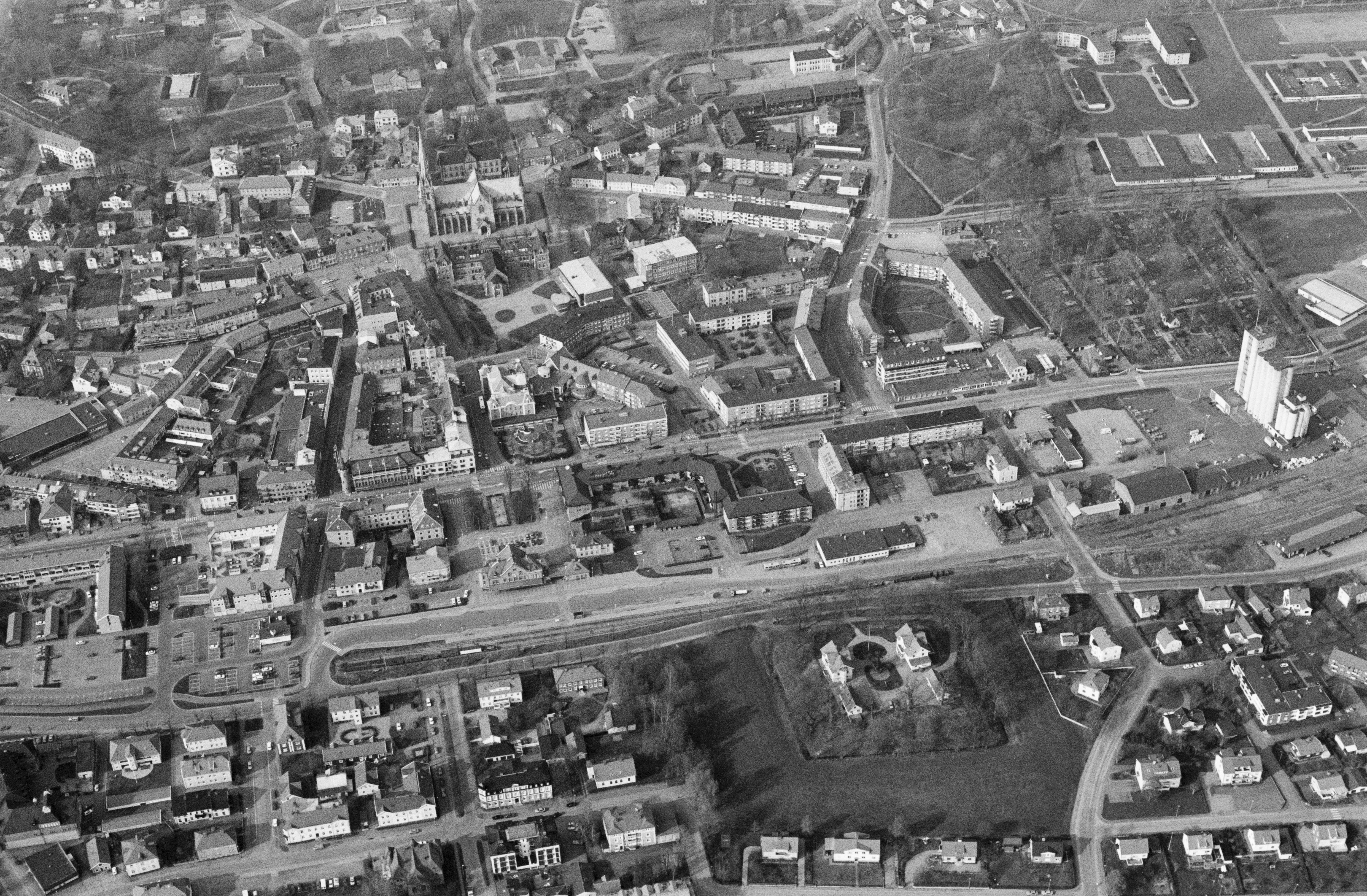 Beskrivning: Skara stad. Skara domkyrka (Sankta Maria) till vänster i bildens övre del. Bilden är tagen mot (väderstreck): SV