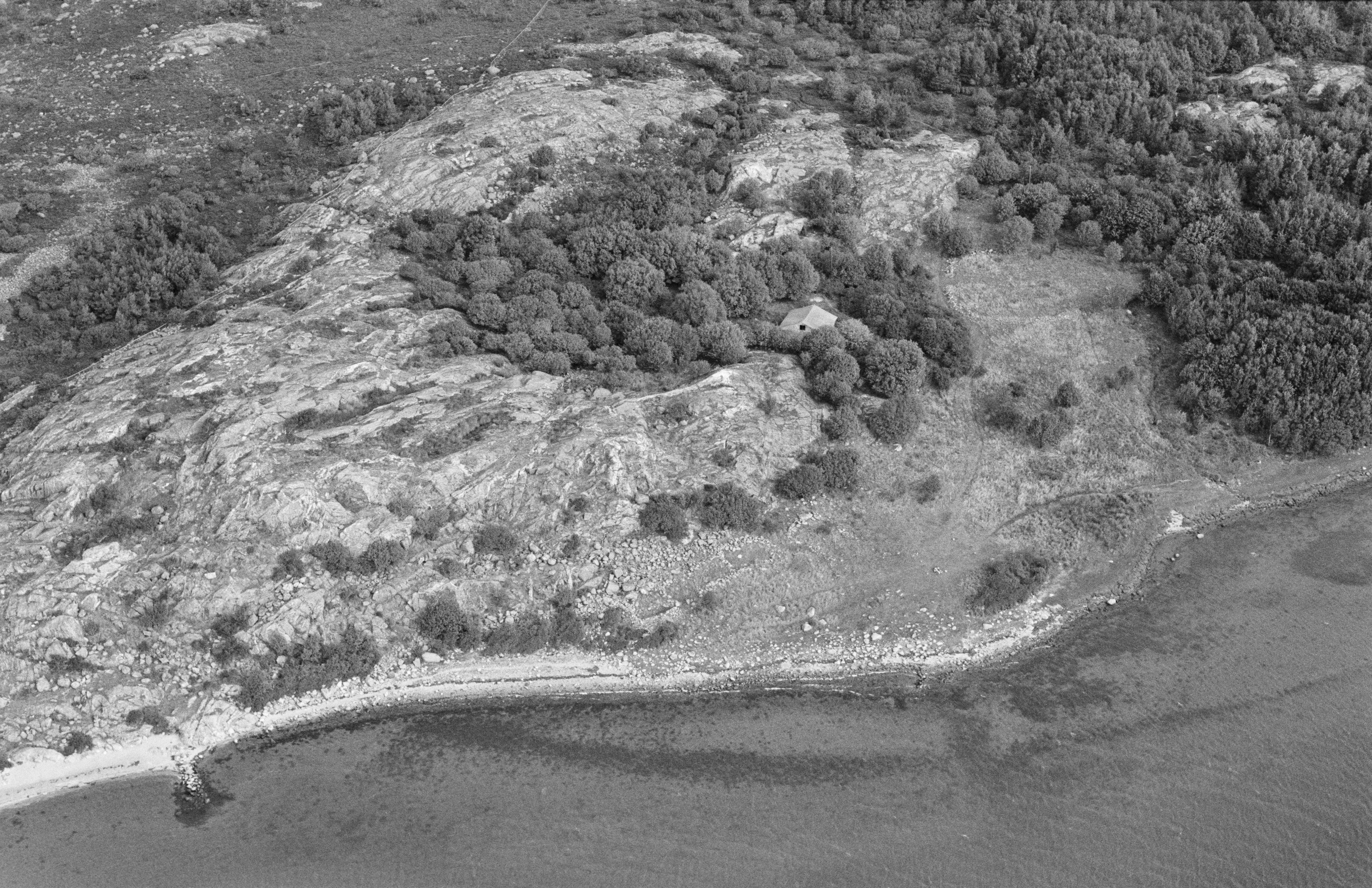 Beskrivning: Tomtningar på södra stranden. Fiskelägen RAÄnr Styrsö 38:1 och uppe till höger begravningsplats Styrsö 21:1. Bilden är tagen mot (väderstreck): N