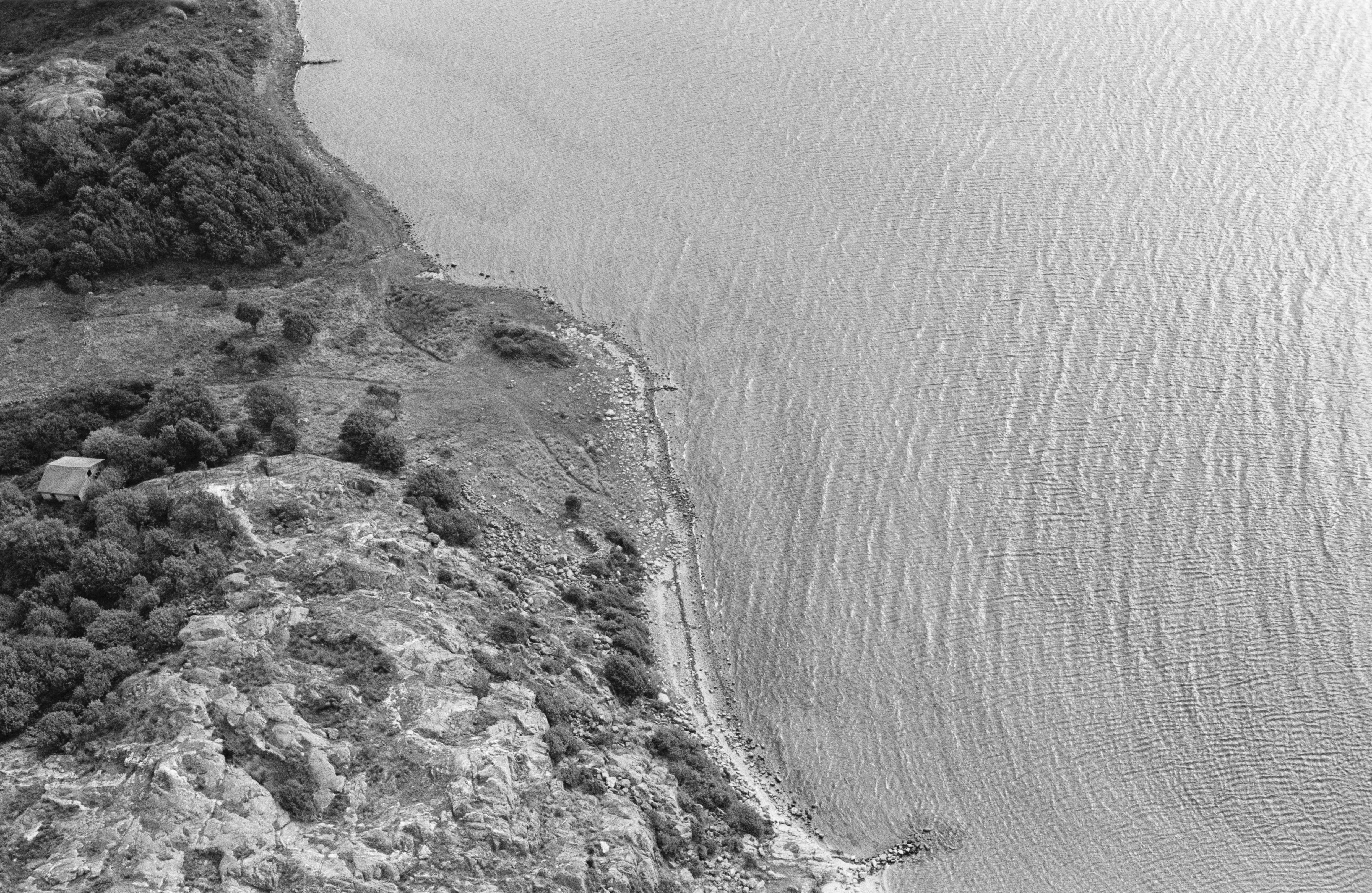 Beskrivning: Tomtningar på södra stranden. Fiskelägen RAÄnr Styrsö 38:1 och uppe till vänster begravningsplats Styrsö 21:1. Bilden är tagen mot (väderstreck): NNO