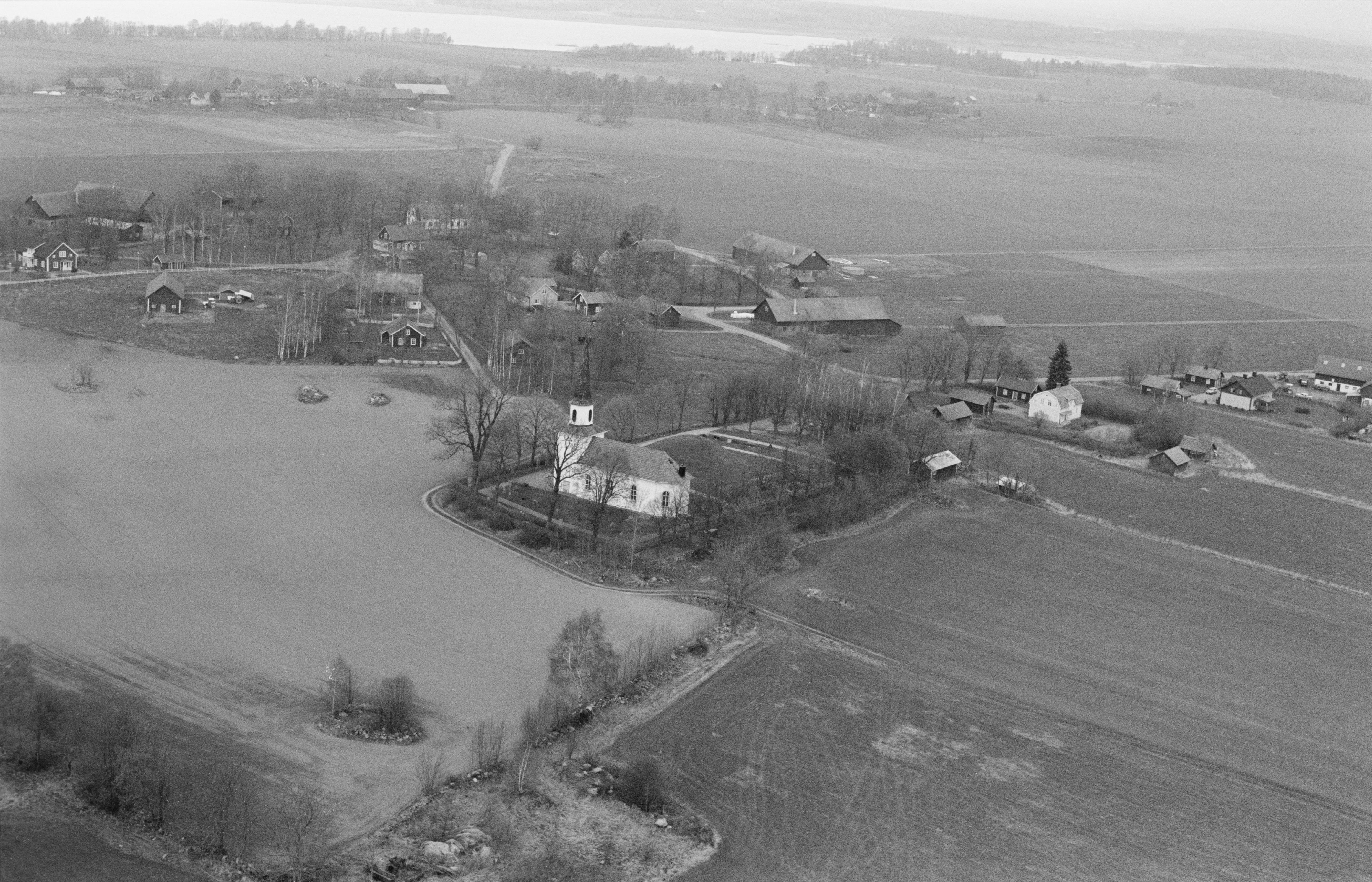 Beskrivning: Flistads kyrka framför storhögen "kung Ranes hög" RAÄnr Flistad 12:1. Bilden är tagen mot (väderstreck): NNO