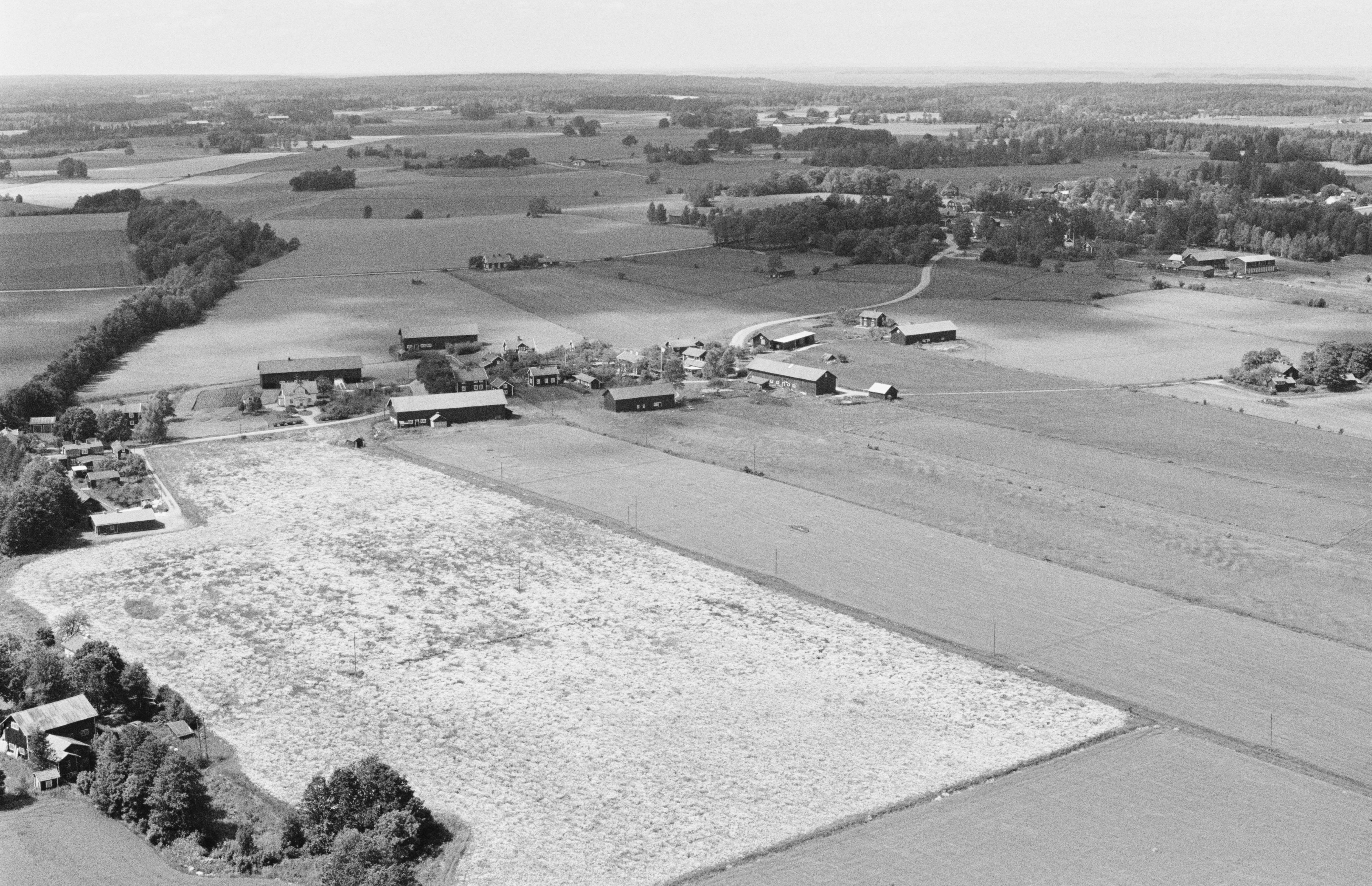 Beskrivning: Hulla by. Hullafors gård nere till vänster vid Gärsån. Uppe till höger Österåkers kyrkby. Bilden är tagen mot (väderstreck): VNV