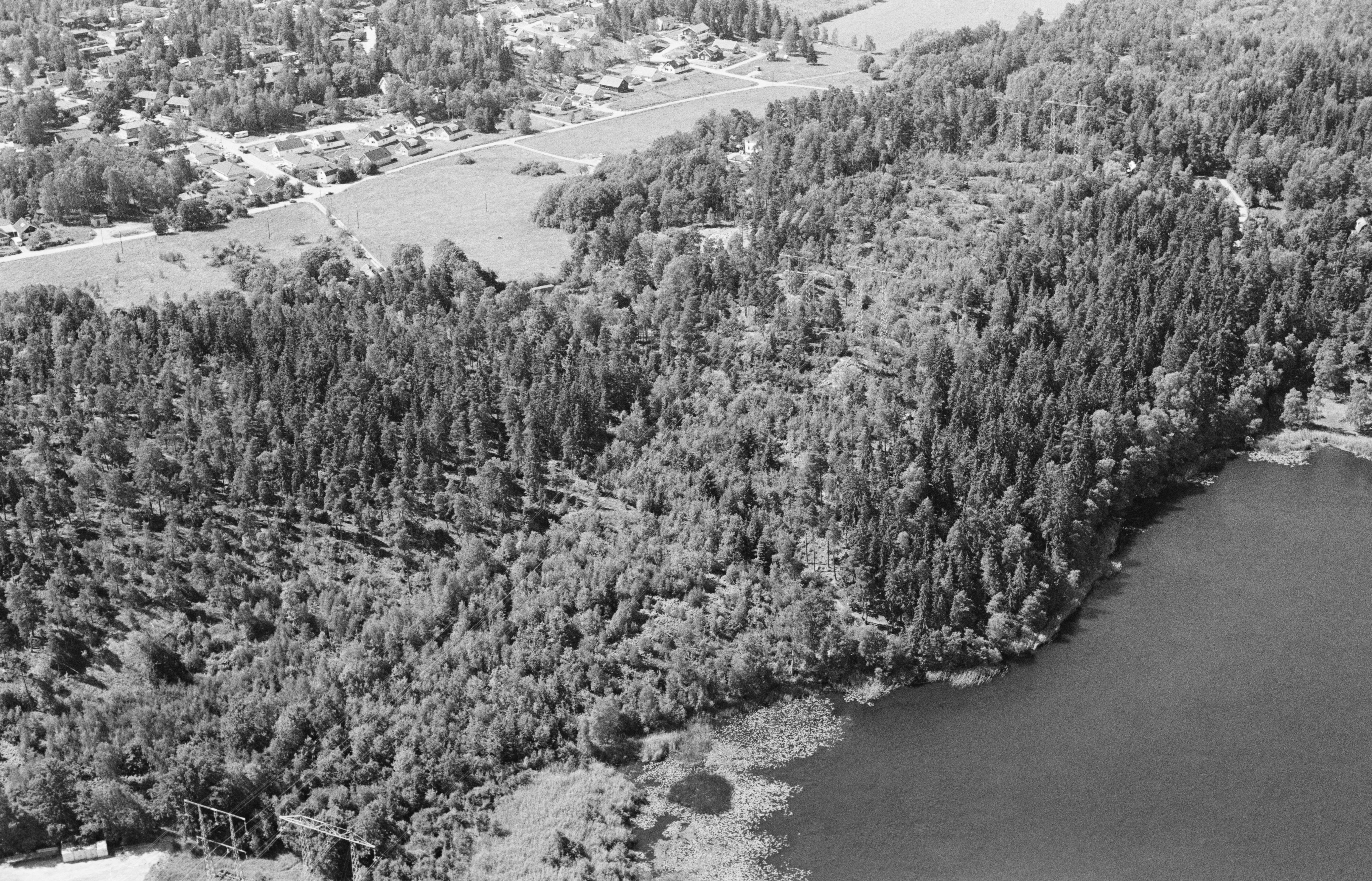 Beskrivning: I bildens övre del arkeologisk undersökning av boplats RAÄnr Botkyrka 371:1 i norra delen av området Vretarna vid sjön Aspen. Bilden är tagen mot (väderstreck): OSO