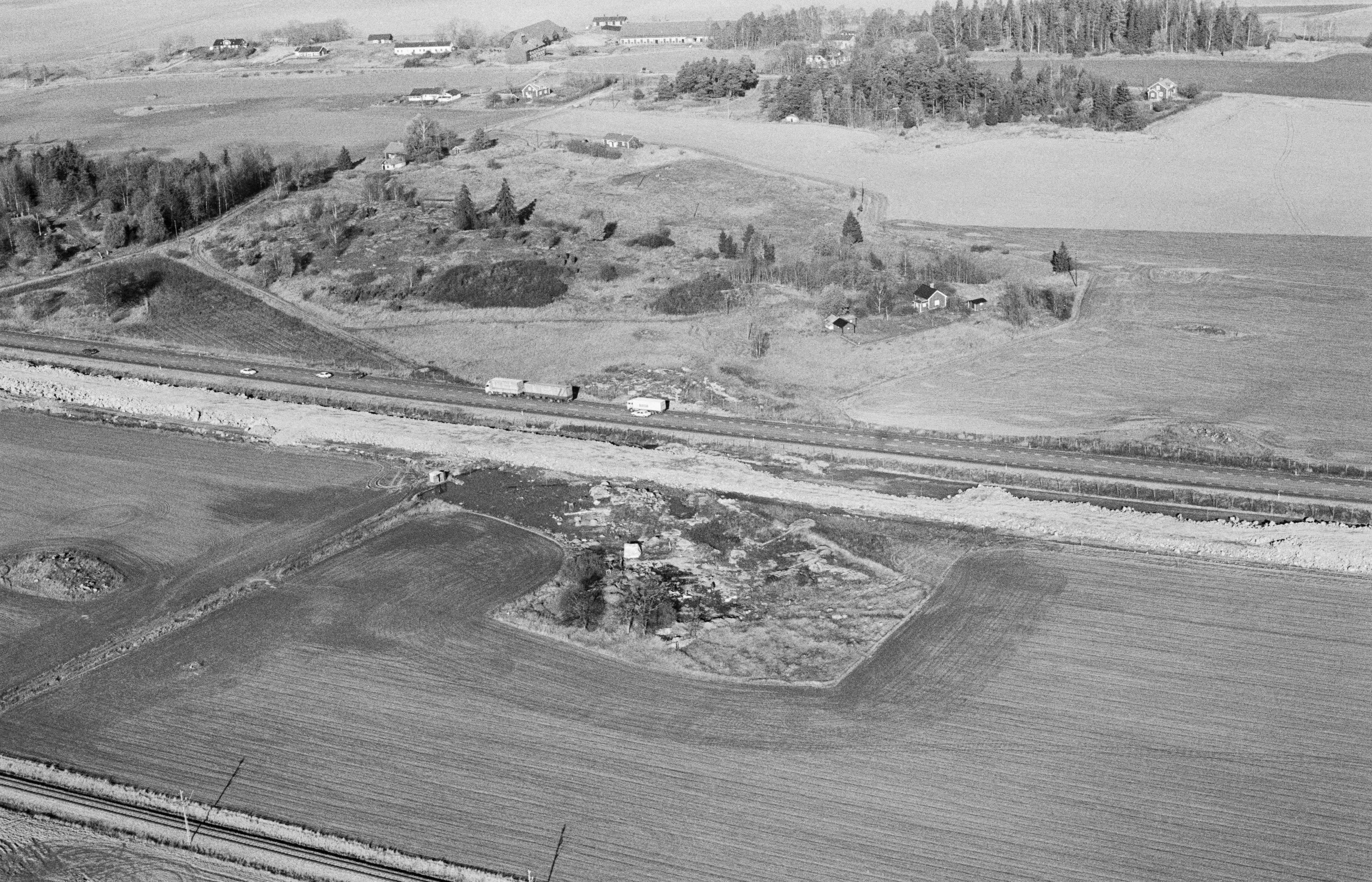 Beskrivning: Arkeologiska undersökningar innan bygge av väg E18 vid Apalle, Högsta och Pollista. I bildens övre del gravfält Dragonbacken RAÄnr Övergran 9:1. Under bildens mitt Pollista gamla tomt RAÄnr Övergran 228:1. Bilden är tagen mot (väderstreck): N