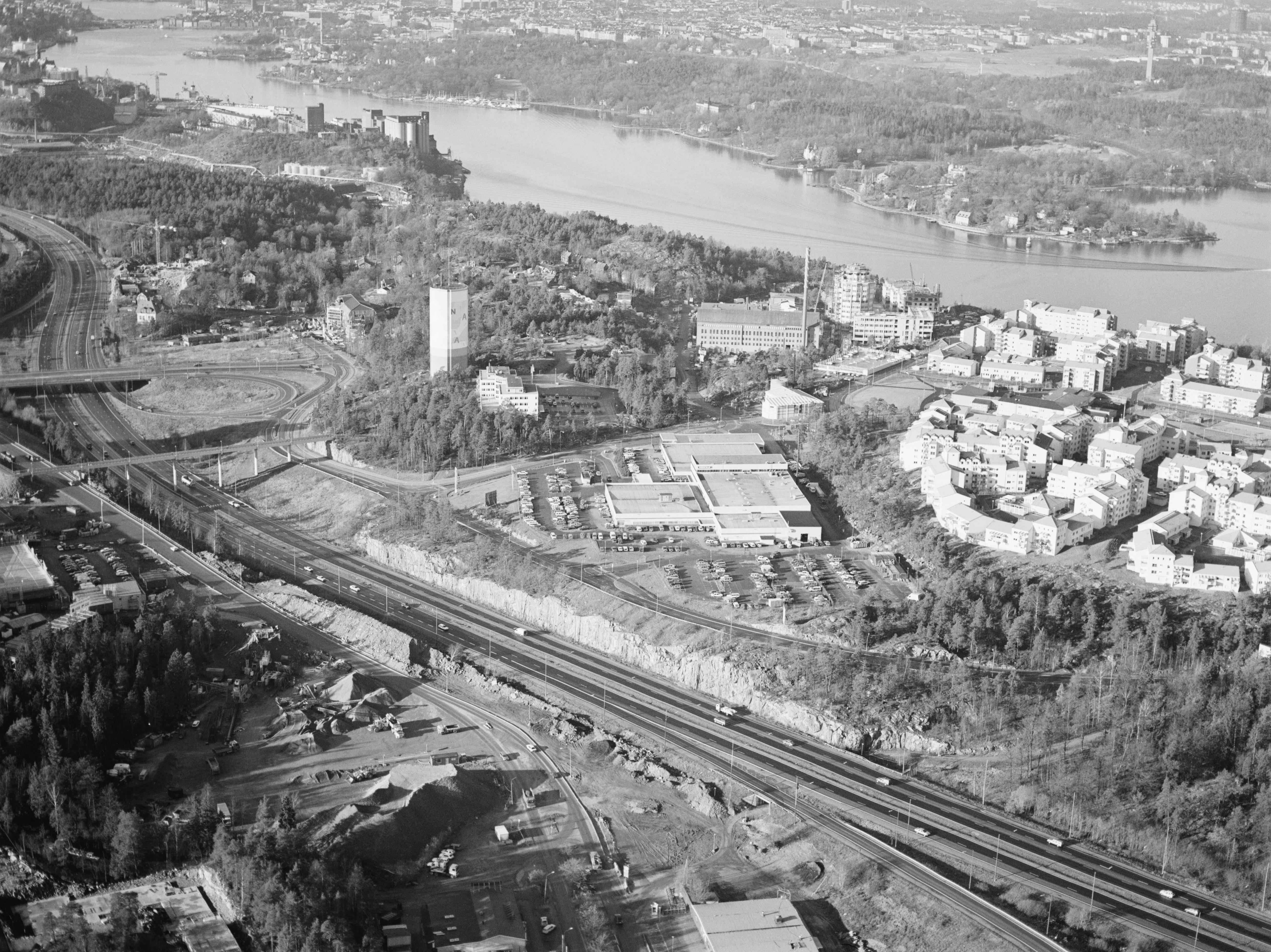 Beskrivning: Järla och Skvaltan vid Nacka centrum på Sicklaön. Vid bildens mitt Jarlaberg, Augustendal, Kvarnholmen, Nacka strand m.fl. I bildens övre del farleden Saltsjön mot Stockholms stad och Djurgården. Bilden är tagen mot (väderstreck): NV