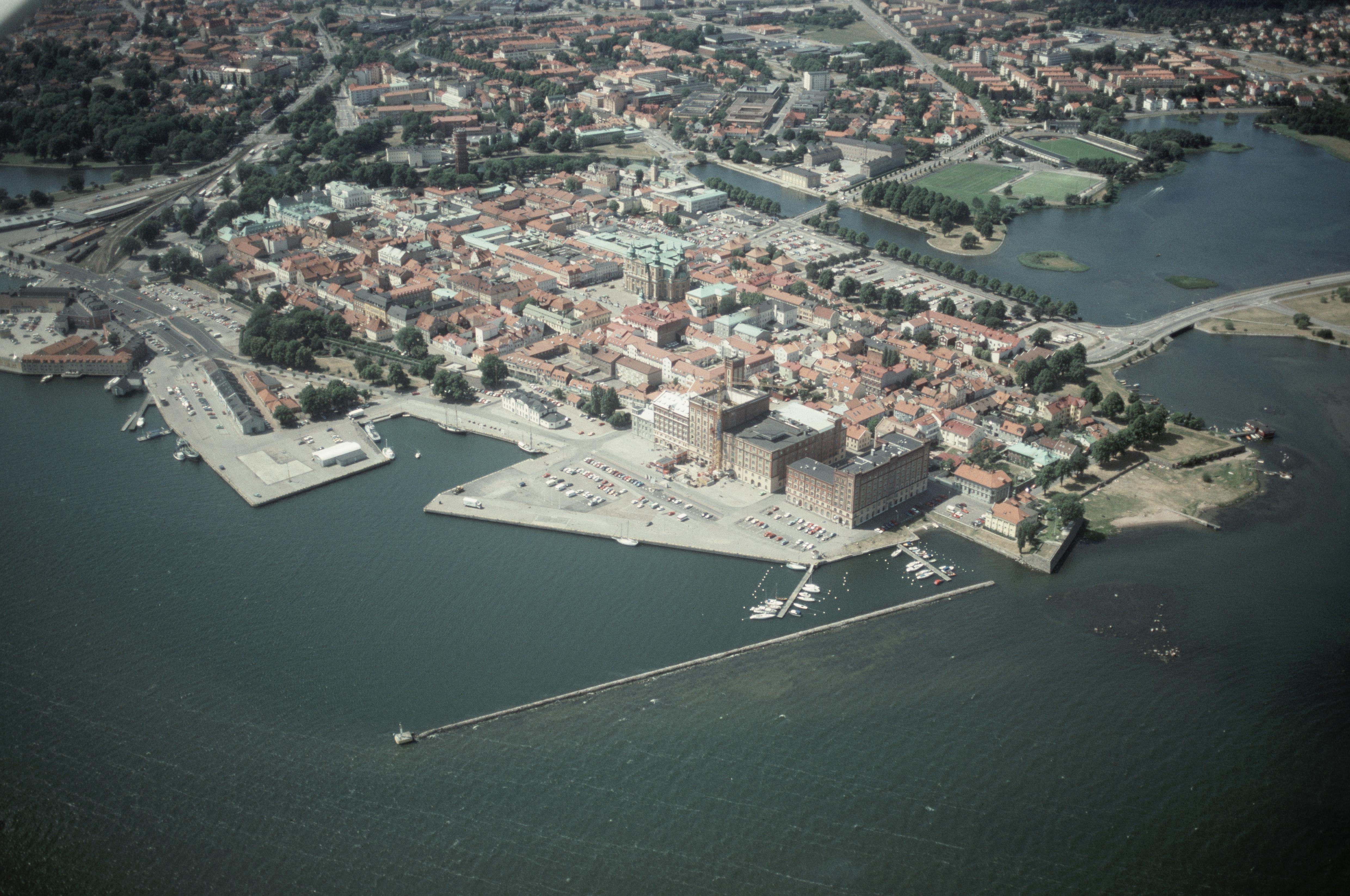 Beskrivning: Kalmar stad. Vid bildens mitt Kalmar domkyrka på Kvarnholmen. Bilden är tagen mot (väderstreck): V
