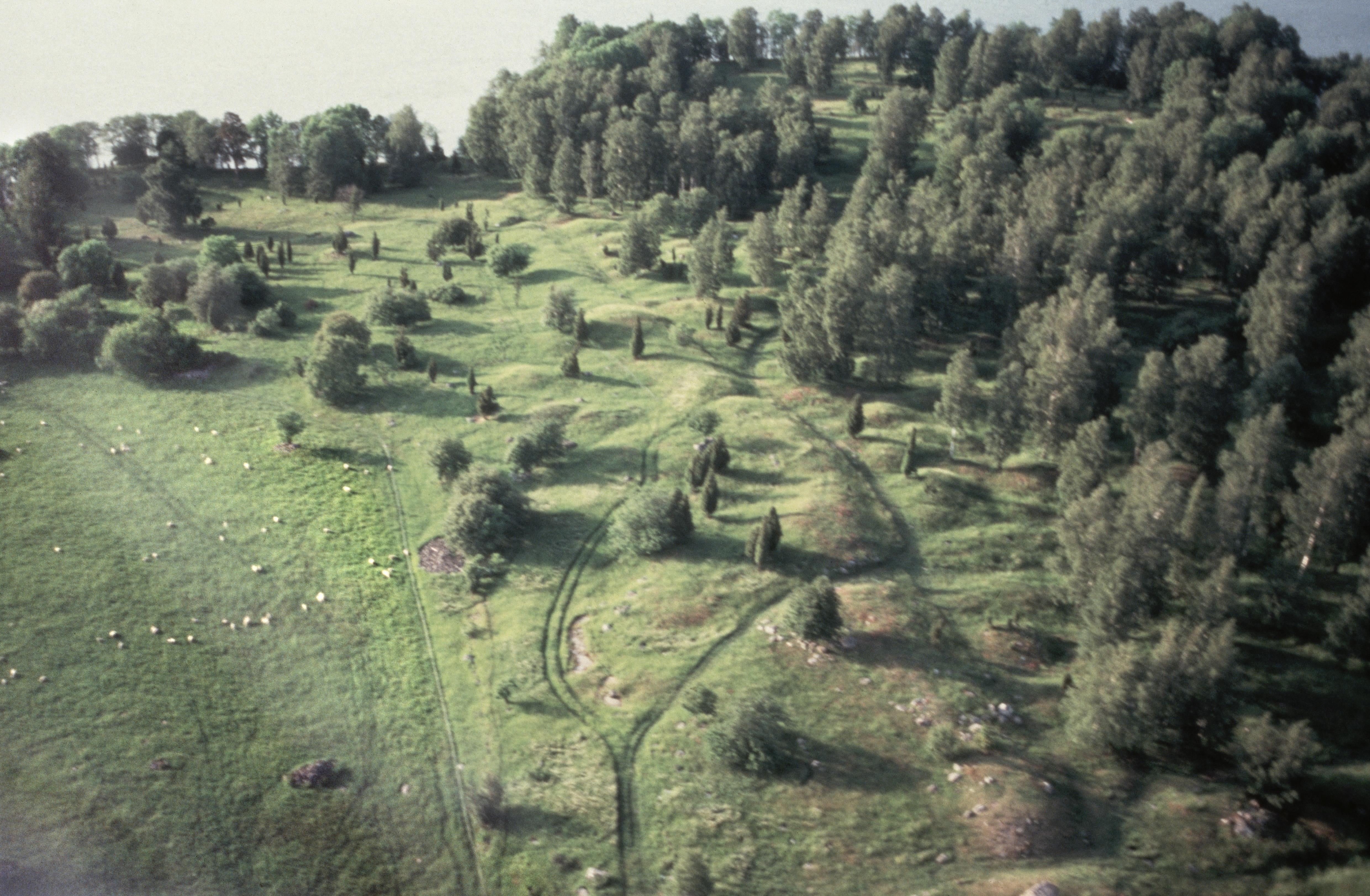 Beskrivning: Fornlämningsområdet Birka på Björkö i Mälaren. Norra delen av ön i området Hemlanden och Svarta jorden RAÄnr Adelsö 118:1. Stadsvallen Adelsö 119:1-2 mot Kugghamn. (NB! Bilden är något oskarp.) Bilden är tagen mot (väderstreck): N