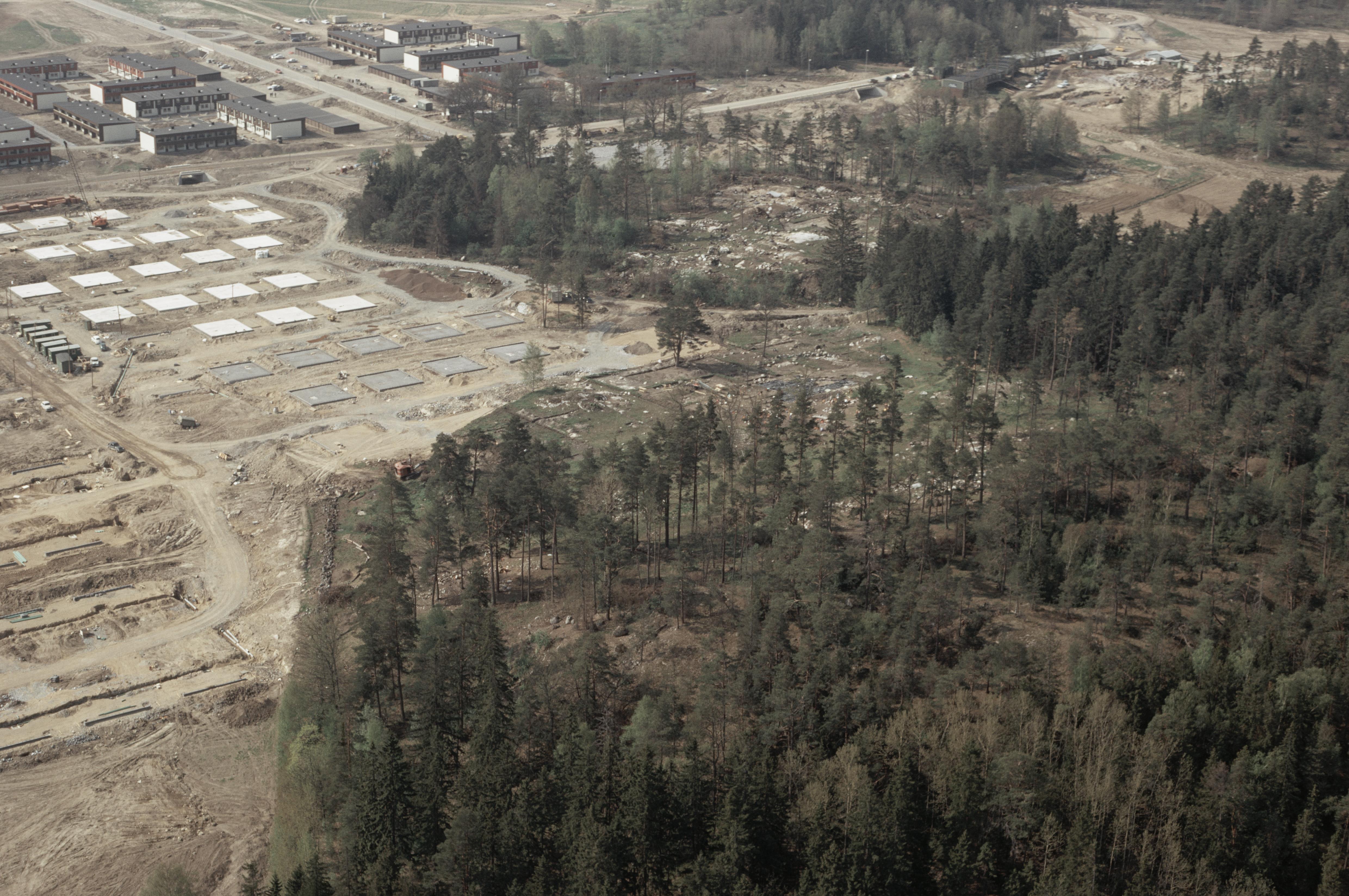 Beskrivning: Lugnet i förortsområdet Hallunda. Arkeologisk undersökning av grav- och boplats RAÄnr Botkyrka 69:1 och RAÄnr Botkyrka 13:1. I bildens övre del Tomtbergavägen. Bilden är tagen mot (väderstreck): SSV