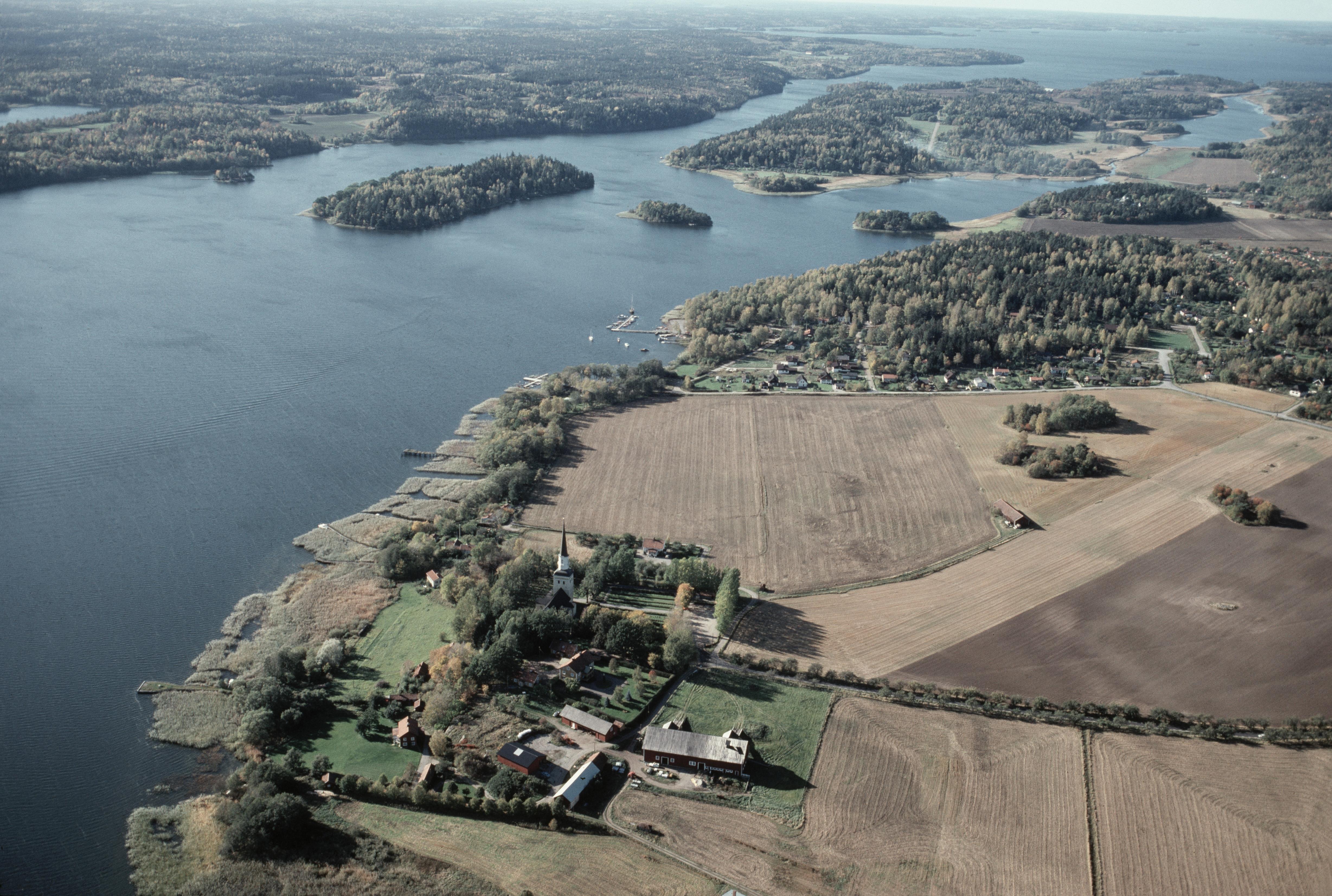 Beskrivning: Kyrkfjärden i Mälaren. I bildens nedre del Ekerö kyrka och Asknäs herrgård. Vid kyrkan flera fornlämningar, bl.a. hög RAÄnr Ekerö 2:1. Helgö till höger i bildens övre del. Bilden är tagen mot (väderstreck): V