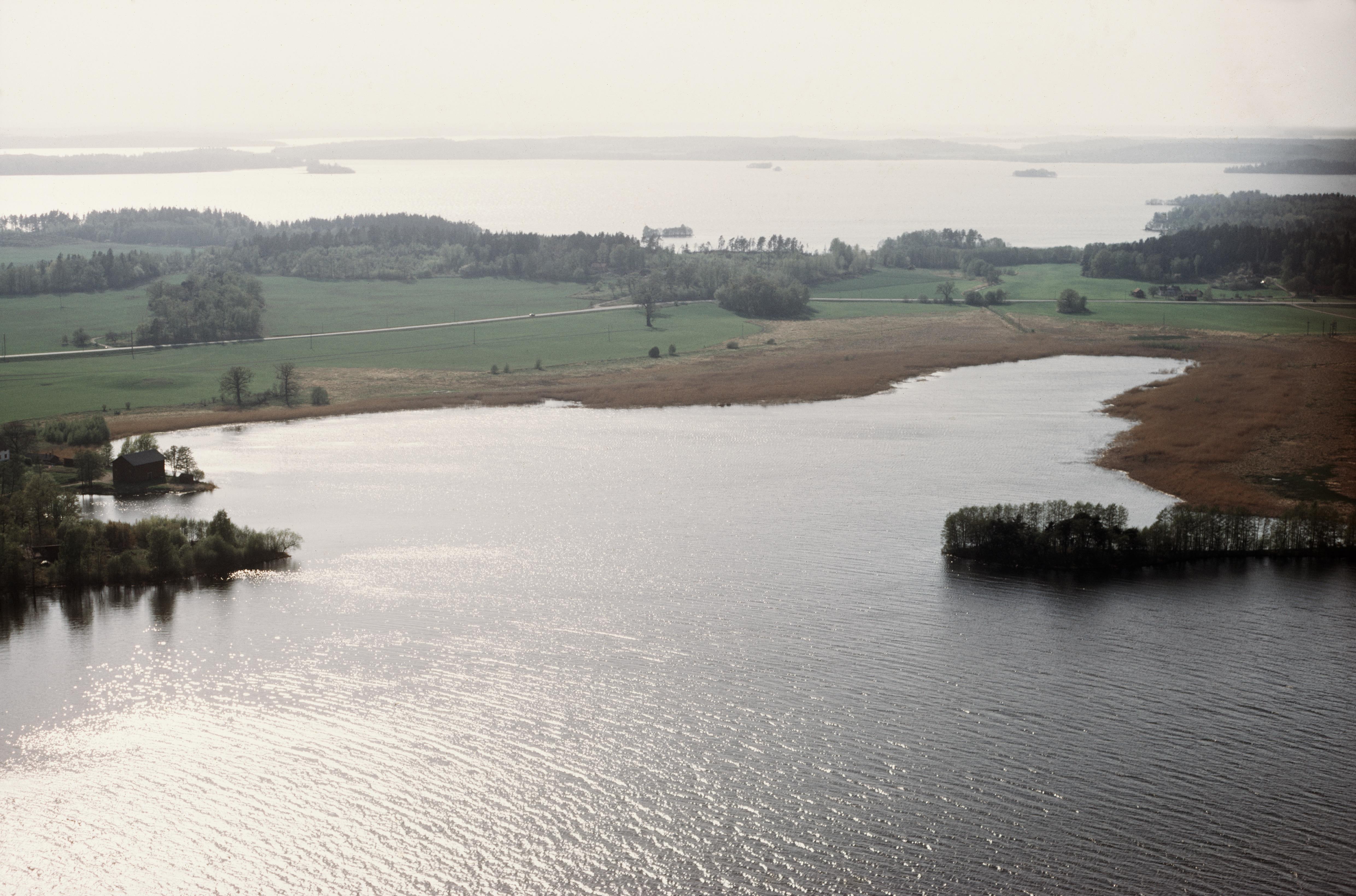 Beskrivning: Munsön i Mälaren, området Kärsön. Till höger viken Fladen i fjärden Långtarmen i Mälaren. Fladen markerar gränsen mellan socken Ekerö (till vänster) och Munsö (till höger). Över bildens mitt husgrund RAÄnr Ekerö 205 vid Berlinsviken. Uppe till höger Kärsösund. Bilden är tagen från (väderstreck): V