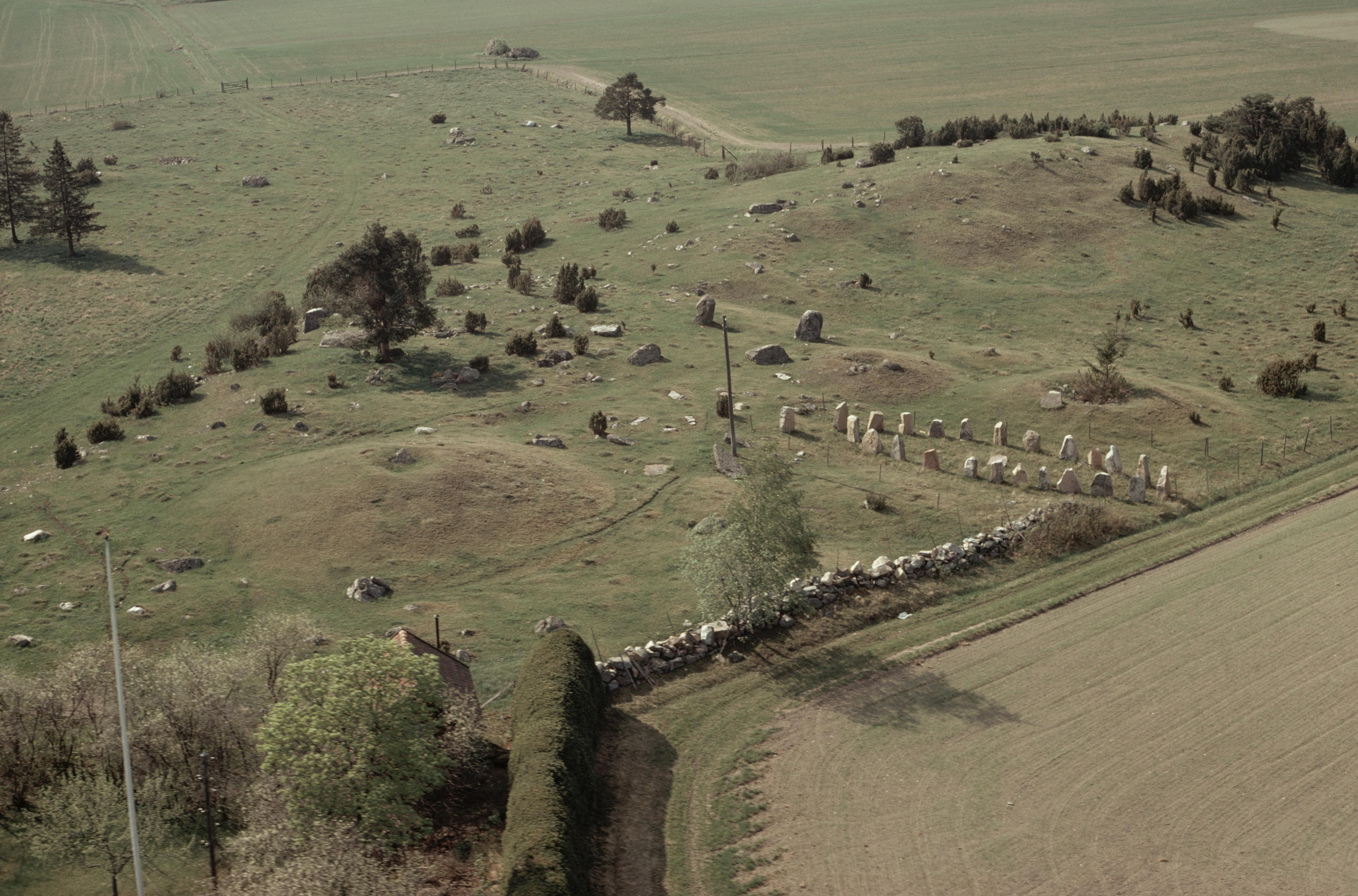 Beskrivning: Gravfält RAÄnr Svedvi 192:1 med 3 högar, ca 25 runda stensättningar, 8 kvadratiska stensättningar, 1 tresidig stensättning, 2 domarringar, 2 skeppssättningar, 1 skeppsformig stensättning samt några resta stenar vid Årby Lötgården. Bilden är tagen mot (väderstreck): SV