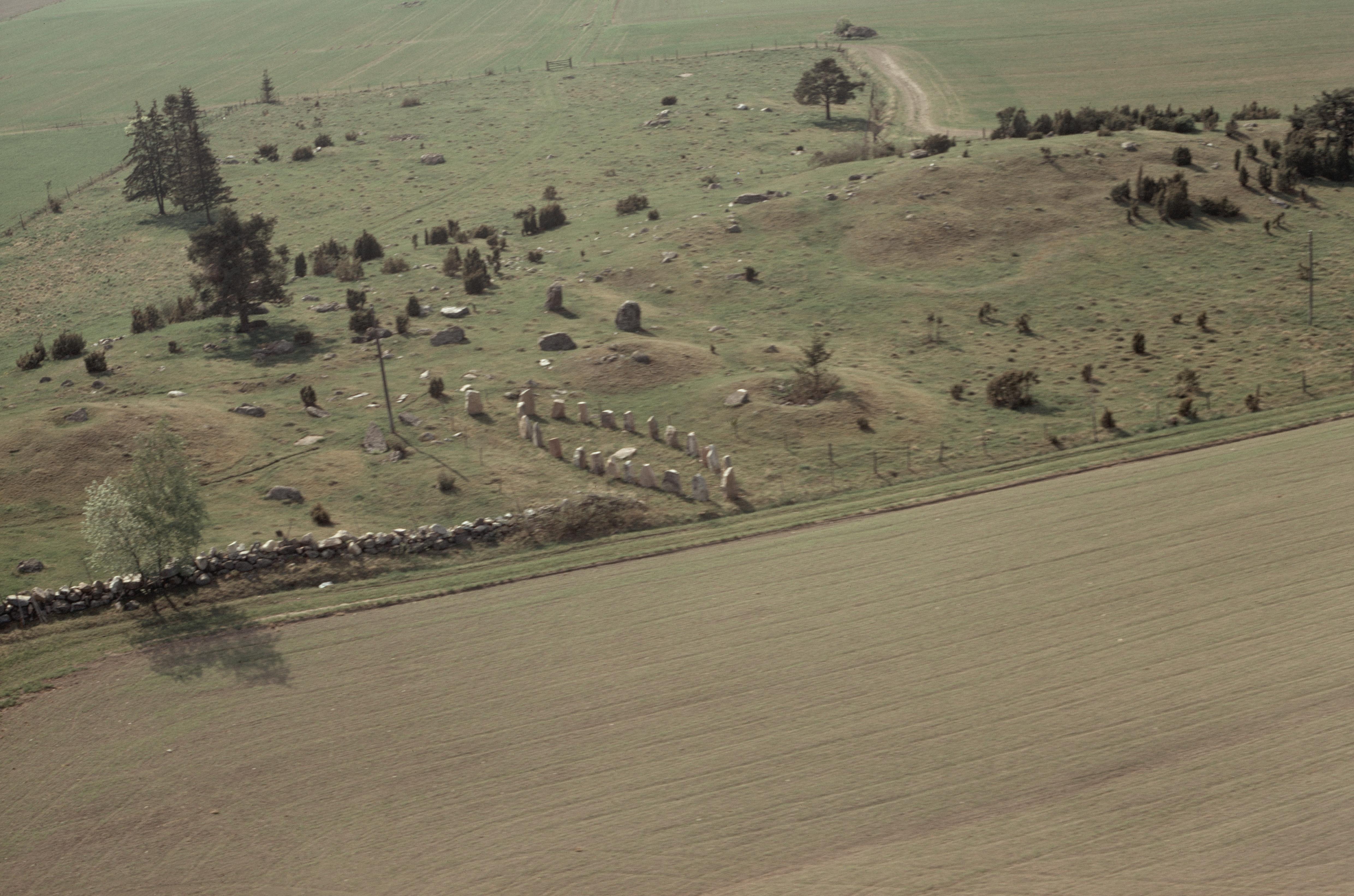 Beskrivning: Årby Lötgården. Gravfält RAÄnr Svedvi 192:1 med 3 högar, ca 25 runda stensättningar, 8 kvadratiska stensättningar, 1 tresidig stensättning, 2 domarringar, 2 skeppssättningar, 1 skeppsformig stensättning samt några resta stenar. Bilden är tagen mot (väderstreck): S